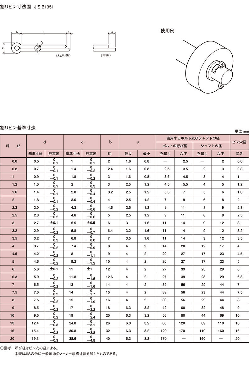【特長】ボルト、シャフトなどのピン穴に差込んで、回り止め、抜け止めとして使います。ピン穴に差込んだ後、先端を曲げて取付ます。再利用は避けます。ステンレス鋼(SUS304)なので、耐食性、耐熱性に優れています。【用途】溝付ナットの戻り止めや、シャフト、パイプに部品の抜落ち防止として使用します。耐食性に優れていますので、湿気の多い場所、屋外にある物に使用します。●この商品は、当店以外でも販売していただいている商品です。タイミングにより、ご注文後在庫切れになる可能性がございます。その際はこちらからご連絡差し上げます。予めご了承のほどお願い申し上げます。●商品画像はイメージ画像です。実際の商品とは色目、長さ、大きさなどが違います。 YHTCODE:03256000040025