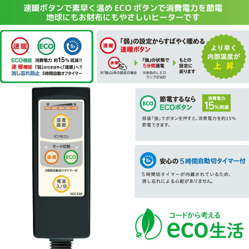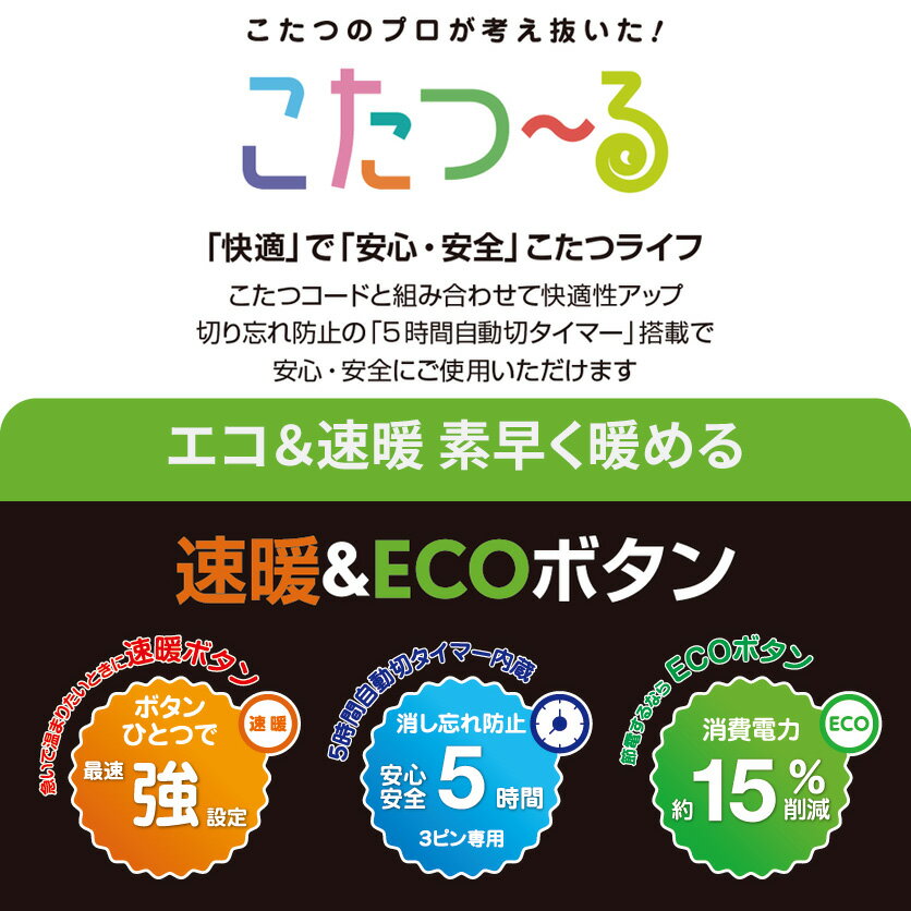 製品仕様型番BC-KEC43B(A)定格AC125V 7A安全装置電流ヒューズ / 5時間自動切タイマー電源コード丸打ちコードタイプコード長さ約3m※メトロ製こたつヒーター3ピン専用です。他社メーカーのヒーターユニットには使用できません。※こたつ以外の電気器具には使用しないでください。※特殊なプラグ形状にはご使用いただけない可能性があります。配達日のご指定について。お届け日のご指定は、出荷に時間のかかる商品に合わせて、指定可能な日数を調整しております。(2〜3営業日で出荷可能な商品でも指定可能日は7営業日以降など)1日でも早い到着をご希望される場合は、日付のご指定を無しでご注文下さい。メトロ電気工業 こたつコード BC-KEC43B(A) 3m 3ピン専用 交換用 速暖ボタン ECOボタン 5時間切タイマー付 コタツコード 125V 7A メトロ製こたつ用 こたつーる METROおすすめのポイントこたつの温度を手元でらくらくコントロールできる手元ICコントローラー。「弱」の設定からすばやく暖める速暖ボタン。消費電力約15%削減。ECOボタン。切り忘れ防止に、安心の5時間自動オフタイマー付き。プラグ内に電流ヒューズ内蔵。異常電流が流れると瞬時に電源を遮断。引っ張りや圧縮などのストレスに強いに丸打ちコードタイプ。L字型器具用プラグでコードが傷みにくい。快適+安全 こたつ〜る手元で楽々!手元ICコントローラー速暖・ECOボタンで快適&省エネ冬の楽しいこたつライフはコードの安全からこたつのプロがとことん考え抜いた、安心構造のこたつコードです。コードの安全設計※お客様にてヒューズの交換はできません。安全装置作動後は修理または、お買い替えをご検討ください。ご使用方法各部の名称など製品画像ピン形状メトロ電気工業製こたつの「3ピン」専用電子コントローラーコードです。こちらもおすすめ中間スイッチ手元コントローラーヒーター+コードこたつ・ヒーター他 ※商品の在庫は、弊社他の店舗でも在庫を共有しているため、在庫更新のタイミングによっては在庫切れが発生する場合がございます。その場合入荷をお待ちいただくか、誠に勝手ながらご注文をキャンセルさせていただきます。何卒ご了承くださいませ。