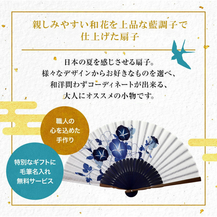 扇子とは四季をうつろう…夏の涼を呼ぶ扇子。1本の扇子を製作するのに30人ほどの職人さんの手を通り、仕上がっていきます。幾千もの歴史によって彩られた日本の伝統美をお楽しみください。名入れただいま、楽天市場出店10年、レビュー10,000件突破を記念いたしまして、扇子の名入れ無料キャンペーンを行っております。当店では、扇子の名入れは手書きでお入れしております。機械での彫刻名入れと違い、難しい漢字もお書きすることも可能です。母の日、父の日、敬老の日、誕生日、記念日、日本土産などの特別なギフトに、是非ご利用くださいませ。筆でお書きしますので、アルファベット、記号はお書きできません。商品によっては2文字が限界のものもございます。カラー鉄線・朝顔種別女性用 扇子扇面綿100%扇骨竹扇子袋ポリエステル100%扇子を広げた時の大きさ(縦×横)約21×37cm箱(縦×横×高さ)紙箱 約11×27×2cm袋の長さ約23cmご注意名入れ・ラッピングがございます場合、出荷までに数日お時間がかかります。こちらの商品は『メール便送料無料』の対象商品です。メール便は、厚さ規定があり日時指定ができませんが、全国一律送料無料にてお届けできます。概ね差出日の2〜4日にお届けでき、またお荷物追跡サービスもあるので安心です。※天候や道路状況によっては遅延が発生する場合があります。※代金引換には対応できません。【 お急ぎの場合は宅配便をおすすめいたします 】詳しくはページ上部にある「お支払・送料・返品」に記載しております。注意事項をご理解の上、ご注文いただきますようよろしくお願い致します。宅配便をお選びの場合、日時指定は可能ですが、お買い上げ金額3,980円に満たない場合、送料が発生します。表書きについて表書きについてはご注文手続き画面に備考欄を設定しておりますので記載の程お願いします。進物体裁については上部ラッピングバナーを参照にお選び下さい。ご指定がない場合はラッピングせずにお送りいたします。当店から暑い夏も扇子があれば大丈夫!エコにも通じるシャレ小物♪当店では和柄から洋柄、シルク製からコットン製など、数百種類の扇子をラインナップしています。関西、東海の有名百貨店、婦人雑貨売場、紳士雑貨売場にも多数出店中!是非、お気に入りの扇子を見つけてください!配送・明細書に関しまして個人情報保護とエコの観点から明細書(納品書)の同封を廃止する事にいたしました。今後「ご注文確認メール」を明細書代わりとさせて頂きます。送料に関しまして、送料無料のお品の場合でも沖縄エリアへの配送には別途770円の加算をさせていただきます。