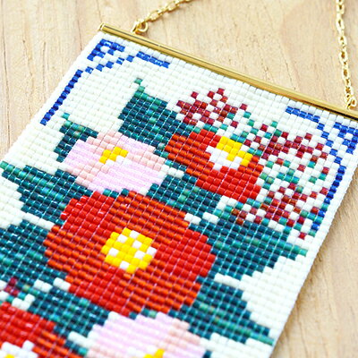 デリカビーズ織りで作る、四季の花々のタペストリーです。シート止め金具を使って、織ったシートの片端を処理するので、シート上側の糸端が見えずキレイに仕上がります。コンパクトなサイズなので、場所を取らず飾りやすいのも嬉しいポイント。また、別売りのハンガースタンド(R60054)に掛けて飾ると、壁にピンなどを刺す必要もなく簡単に飾れますよ。冬に彩りを添えるピンクと真っ赤な椿、そして「難を転ずる」に音が似ていることから縁起の良い木とされている南天のデザインです。サイズ:約6cm×約17.5cm(チェーン含む)金具の色味:ゴールド使用する道具:はさみ、ものさし、織機(LM-21R)、マットまたは布など、ラジオペンチ、ニッパー、プライヤー(先の細いペンチ)、テープ備考:織機(LM-21R)《別売り》が必要なキットです。