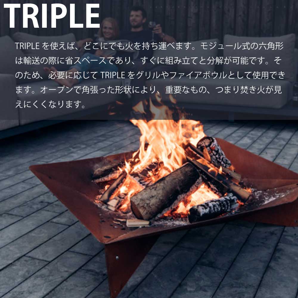 【本体サイズ (約)】:W900mm×D780mm×H240mm【本体重量 (約)】:13kg【素材】: コールテン綱【備考】:メーカーにより商品のサイズや重量等の改定がある場合がございます。ご了承ください。【生産国】: ポーランド3つのパーツを組み合わせて作るヘキサゴン型のファイヤーピットで、ダイナミックに炎を楽しめる90サイズ。 TRIPLE を使えば、どこにでも火を持ち運べます。モジュール式の六角形は輸送の際に省スペースであり、すぐに組み立てと分解が可能です。素材はコールテン綱で、時の経過とともに保護錆が出て表面を保護。 魅力的な六角形の形状からは、燃え盛る炎がはっきりと見えます。どこから見ても純粋なキャンプファイヤーの気分。 モジュール式ファイヤーボウルとグリル コンパクトに分解して持ち運び可能 独特の保護性のある錆びた緑青を生成します。 多機能: オプションのグリル焼き網、プレートなどで拡張可能