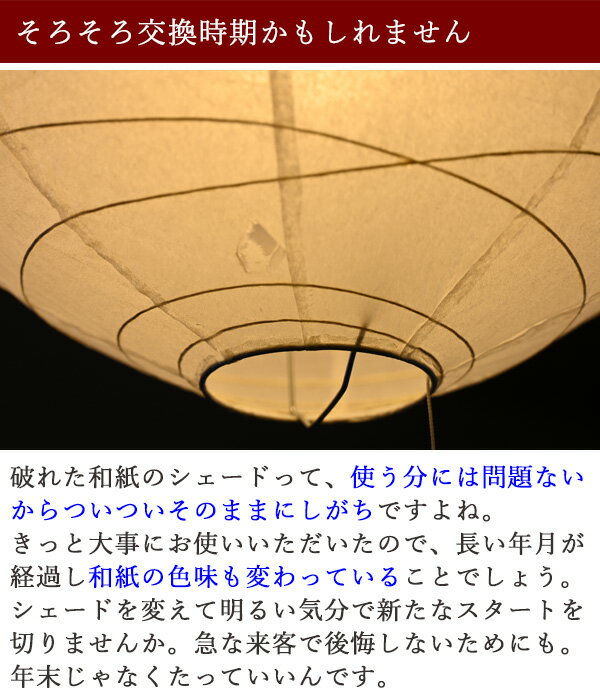 注意!!こちらはランプシェードのみです。ペンダントライトとしてお使いになる場合は 下記の各部品を合わせてご購入ください。 サイズ:600φ(mm) 素材:和紙 対応ソケット:1〜3灯用トップページ > カスタム照明 > セード > カスタムセード ちょうちん600φ 和紙ランプシェード ちょうちん600φ 直径60cmのある存在感抜群の和紙のランプシェードです。 和紙に劣化はつきもので、破れたり、変色したり、 でも使う分には問題ないのでそのままお使いになられている方も 多いのではないでしょうか? シェードを新しく変えるだけでお部屋の雰囲気はガラッと変わります。 気分も晴れやかになり、前向きな気持ちにもなれることでしょう。 規格があえばお手元の灯具はそのままお使いいただけますので 無駄な出費も抑えられます。また取り換え時期になってもほとんどが紙なので 地球環境にもやさしい製品です。 シェードを取り換えて新しい気持ちでスタートしませんか。 注意!!こちらはランプシェードのみです。ペンダントライトとしてお使いになる場合は 下記の各部品を合わせてご購入ください。 サイズ:600φ (mm) 素材:和紙 対応ソケット:1〜3灯用 ソケットをお持ちでない方は下部の「このページの セードにセットするソケットをお選びください」のバナーを クリックしそちらでお求めくださいませ。 またどのように組み合わせたらよいか分からない方には お勧めのセットをご用意させていただきました。 お部屋の広さに応じて下記よりお選びくださいませ。 *こちらの商品にはサイズ違いもございます。直径30,37,45cmは→こちら 【お読み下さい】 ご購入前に天井の配線器具をご確認ください。 ※右3タイプの配線器具にご使用頂けます。 いずれの器具もついてない場合は電気工事が 必要となりますのでご確認の上ご購入ください。 *関連ワード* 照明/シェードのみ 直径600φ/美濃機械すき和紙ランプシェード/電気/和風/和室/寝室/店舗/飲食店/セード/傘/ちょうちん/LED/交換用/補修用/取り換え/おしゃれ/日本製/大きい/特大/chouchin/和紙/和風/照明/照明器具/ちょうちん/ランプシェード/ランプセード/ペンダントライト/ペンダント/おしゃれ/天井/天井照明/傘/LED/インテリア/ライト/リビング/ダイニング/和室/おすすめ/補修・交換用としても/丸/円形/円型/高級/破れにくい