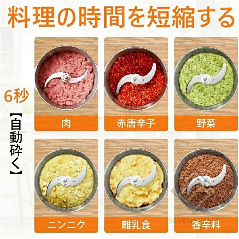商品名 フードプロセッサー本体容量 2L~3L商品重さ 約2kg定格入力 110-240V定格出力 300WPSE認証 認証済み毎日のお料理のベストパートナー 忙しい毎日、料理はなるべく時間をかけずに、ぱっと簡単に作ることができます。刻む・砕く・つぶす・混ぜる・練る・おろす・泡立てるがこれ一台で調理できます!お子供様の離乳食や調味料、ミルクセーキ、カキ氷、ダイエット食などの様々な場面で応用できます。本製品はどんな家庭にとっても不可欠な物です。これ1台だけで料理の幅がグンと広がります。3L大容量・操作簡単 300W純銅モーターを搭載し、鋭いカッターが上下に2枚ずつ、計4枚付いていて、3Lの大容量フードプロセッサーなので、一気に大量の食材を入れても調理ができます。1-6人家族でも余裕に使うことができます。ボウルに調理素材を入れて本体をセットしたら、本体上部のスイッチを押すだけで、野菜のみじん切りやお肉のミンチが数秒で完成します。お子様の離乳食から、お年寄りの介護食まで、初心者でも幅広い世代の食事を手早く簡単に作ることができます。二種類のボウルはより多くの選択肢を提供できる 高級304食品級ステンレス鋼ボウル、軽量ながら耐久性に優れており、長く使い続けてもニオイが付きにくく、汚れを落としやすいため、衛生的に保証できます。丈夫なガラス製クリアボウル、透明で中身の様子を確認しやすく、みじん切りや、生地ごねに便利、食材の色や匂い移りが少ないのが魅力。美観&健康&無味、10秒で完全に洗浄、面倒なお手入れとは永遠に別れます!二種類ボトルので、パセリ、玉ねぎ、セロリ、野菜、果物、肉など豊富なお料理に活用できます。食材の状態をいつでも把握でき、油汚れも簡単に落とせます。調理後に、おしぼりで本体を拭けば匂いさえ残りません。二段階切替可能・使いやすい 調理方法と場所によって食材の仕上がりを変化させたい人には、二段階スピード調節機能がありますから便利です。「低速I」ボタンは果物、玉ねぎ、にんにくなど柔らかい材料を刻む、「高速II」ボタンはナッツ、ニンジン、肉など硬い材料を刻むことができます。ボタンを押すだけの簡単操作!料理下手な方でも簡単に使える優れた人気フードプロセッサーです。衛生安全保護・水洗可能・1年の安心保障 フードぷろせっさーは、過熱保護と誤作動防止の安全装置を搭載しており、すべての部件が正しくセットした後のみ動作します。モーター以外の容器、カッターと蓋は丸洗いできて、いつも清潔な状態を保つことができます。ステンレス製の容器はグラス容器より軽い、丈夫なので、落としてもほとんど割れず安全です。ガラス製クリアボウルにおいがつきにくく衛生的です。ボウルの底に滑り止めリングが付いてますので、稼動中にも安定!