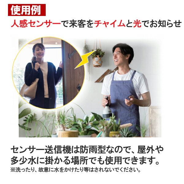 ■商品特長 人の動きを感知して離れた受信機へ「音」と「光」でお知らせします。 ・人の動きを感知して受信機へ送信 ・マグネットや両面テープで取り付けも簡単! ・抜群の飛距離で、屋外見通し距離最大180m ・ワイヤレスなので配線不要!取付簡単! ・電波の届く範囲であれば何台でも増設可能。 ・送信機の電池切れが受信機でもわかる、電池切れお知らせ機能付き ・送信機は、防雨型で屋外や多少の水のかかる場所でも使用可能!(防水仕様ではありません) ・電波は256通りのIDコードで混信しにくくなっています。 ※ご使用にあたって※ ・電波の飛距離は、設置環境によって短くなります。 ・受信チャイムは、防水仕様ではありませんので屋内または雨や水にかからない場所でご使用ください。 ・それぞれ単体での使用はできませんのでご注意ください。 人感センサー送信機 仕様 電源 単4形アルカリ乾電池×3本(別売) 又はACアダプター(別売) 併用不可 電池寿命 約2年(1日10回送信、20℃時) 電池切れ表示 送信ランプ赤点滅 送信周波数 315MHz 使用温度範囲 -10℃~+45℃ 送信方法 センサーの感知により送信 使用エリア 屋内/屋外(防塵形・防噴流形(IP55相当)で屋外や多少水のかかる場所でも使用可能)(防水仕様ではありません) 選曲方法 選曲ボタン∨(送り)Λ(戻り)を押して選曲 外形寸法 77W×83H×35D(mm) 本体質量 約82g(電池を含まない) チャイム受信機 仕様 電源 単3形アルカリ乾電池 3本(別売)又は ACアダプター(別売) 併用不可 電池寿命 約6ヶ月(1日10回受信、20℃時) 電源スイッチ あり 受信表示 青ランプが点滅 電池切れ表示 あり 音量調節 音量ボタン 大(▲)/小(▼)8段階 音量可変範囲 45~90dB/1m 使用エリア 屋内専用 使用温度範囲 -10℃~+45℃ 外形寸法 90W×91H×32D(mm) 本体質量 約85g(電池を含まない) 共通 仕様 電波到達距離 屋外見通し最大180m/屋内見通し最大90m IDコード数 256通り:記号-番号 付属品 IDコード設定スイッチ切換用(-)ミニドライバー ★ワイヤレスチャイムについて [このような用途におすすめ] インターホン 防犯 介護 呼び出し 来客 来客対応 高齢者 介護 徘徊対策 セキュリティー モーションセンサー 動き 動作 反応 動きに反応 人に反応 [おすすめ取り付け場所] 玄関 寝室 トイレ 洗面所 リビング ベッドサイド 介護施設 飲食店 レストラン 喫茶店 居酒屋 店舗 商店 お店 施設 2階建て 3階建て 木造 工場内 観光施設 [便利な機能] ・配線不要/ 取り付け簡単 ワイヤレス コードレス 工事不要 ・人感センサー 人や動物の体温に反応して センサーを横切った場合にお知らせします。 ・電池式なので持ち運びも便利 ・音量調整/チャイム音/音楽も変えられます ・光と音でお知らせします ・送信機は防雨型で屋外、多少の水のかかる場所での使用可能 ・人の動きをセンサーが感知 ・感度調整機能付き ・受信機/送信機は同じシリーズなら増設可能です ・周波数変更で混線も防げます ■増設可能な対応機種 【XPシリーズ】 [受信機送信機セット] XP710A/XP710AM/AP710T/XP710G/XP210B/XP730A/XP750A/XP750AG/XP760/ XP1250A/XP310A/XP1050AG/XP1910C/XP1910E/XP4010A/XP1710B XP710H/XPN710H/XP710K/XPN710K/SDX1050AG [増設用受信機] XP700/XP700M/XP4000/XP1000/XP300/XP200/XP120/XP1700/XP1900 [増設用送信機] XP10A/XP10B/XP10G/XP10E/XP10T/XP10C/XP30A/XP50A/XP50AG/XP60/ XP10H/XPN10H/XP10K/XPN10K 【Xシリーズ、XシリーズPREMIUM】 [受信機送信機セット] X810/X810R/X810G/X830/X210D/X255/X850/X855/X860/X870/X875/X910D/ X890/X880SL/X310/X1810/XL3010/XL3050/ [増設用受信機] X800/X900/X200/X300/X100/X1800/XL3000/ [増設用送信機] X10/X10R/X10G/X10D/X30/X50/X55/X60/X70/X80SL/X90 ※IDコードを受信機・送信機統一していただきましたら、Xシリーズ、XシリーズPREMIUMでもご使用可能です。※Xシリーズ、XシリーズPREMIUMでご使用の場合、選曲は16曲のみとなります。 人の動きを感知して受信機へ「音」と「光」でお知らせします。 ・人の動きを感知して受信機へ送信 ・マグネットや両面テープで取り付けも簡単! ・抜群の飛距離で、屋外見通し距離最大180m(木造3階建なら1階から3階まで届きます。) ・ワイヤレスなので配線不要!取付簡単! ・電波の届く範囲であれば何台でも増設可能。 ・送信機の電池切れが受信機でもわかる、電池切れお知らせ機能付き ・送信機は、防雨型で屋外や多少の水のかかる場所でも使用可能!(防水仕様ではありません) ・電波は256通りのIDコードで混信しにくくなっています。 ・チャイム音は、チャイム・メロディ・音声・動物の鳴き声・アラーム・サイレンなど64種類! ※ご使用にあたって※ ・電波の飛距離は、設置環境によって短くなります。 ・受信チャイムは、防水仕様ではありませんので屋内または雨や水にかからない場所でご使用ください。 ・それぞれ単体での使用はできませんのでご注意ください。 他おすすめ機器はこちら 増設用人感センサー 送信機 人の動きを感知して受信機へ送信 増設用呼び出しチャイム 受信機 離れた場所で「音」と「光」でお知らせします 電池セット 屋外や受信機持ち運びにおすすめ ACアダプターセット 屋内で固定して使用におすすめ 送