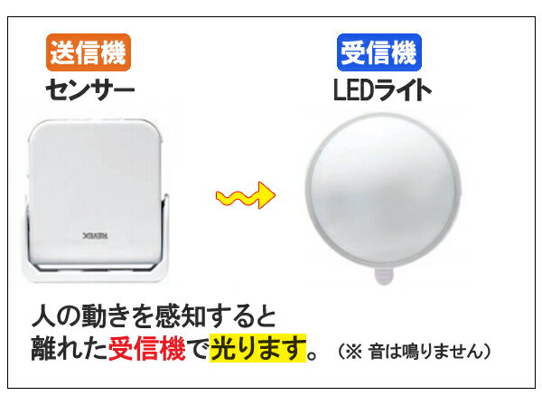 ■商品特長 センサーが感知すると離れた場所でライトが点灯(音は鳴りません) ・人の動きを感知して受信機へ送信 ・マグネットや両面テープで取り付けも簡単! ・荷物の多い日も安心便利 ・防雨仕様で軒先や玄関にも ・抜群の飛距離で、屋外見通し距離最大180m ・ワイヤレスなので配線不要!取付簡単! ・電波の届く範囲であれば何台でも増設可能。 ・送信機の電池切れが受信機でもわかる、電池切れお知らせ機能付き ・防雨型で屋外や多少の水のかかる場所でも使用可能!(防水仕様ではありません) ・電波は256通りのIDコードで混信しにくくなっています。 ※ご使用にあたって※ ・電波の飛距離は、設置環境によって短くなります。 ・それぞれ単体での使用はできませんのでご注意ください。 ■商品仕様 ▼人感センサー送信機 電源:単4形アルカリ乾電池 3本(別売) ACアダプター(別売) 併用不可 電池寿命:約2年(1日10回送信、20℃時) 電池切れ表示:送信ランプ赤点滅 送信周波数:315MHz 使用温度範囲:-10℃~45℃ 送信方法:センサーの感知により送信 使用エリア:屋内/屋外(防塵形・防噴流形(IP55相当)で屋外や多少水のかかる場所でも使用可能)(防水仕様ではありません) 選曲方法:選曲ボタン∨(送り)Λ(戻り)を押して選曲 外形寸法:77W×83H×35D(mm) 本体質量:約82g(電池を含まない) ▼受信LEDライト 電源:単3形アルカリ乾電池 3本(別売) ACアダプター(別売) 併用不可 電池寿命:約3ヶ月(1日10回受信、20℃時) 電源スイッチ:あり 受信表示:64種類から選択したランプが点灯・点滅 電池切れ表示:あり 使用エリア:屋内/屋外(防塵形・防噴流形(IP55相当)で屋外や多少水のかかる場所でも使用可能)(防水仕様ではありません) 使用温度範囲:-10℃~+45℃ 外形寸法:105W×115H×60D(mm) 本体質量:約148g(電池を含まない) <▼共通> 電波到達距離:屋外見通し最大180m/屋内見通し最大90m IDコード数:256通り:記号-番号 <▼付属品> IDコード設定スイッチ切換用(-)ミニドライバー ★ワイヤレスLEDライトについて [このような用途におすすめ] 照明 ライト 防犯 来客 来客対応 介護 [おすすめ取り付け場所] 玄関 軒先 寝室 トイレ 洗面所 リビング ベッドサイド 介護施設 飲食店 レストラン 喫茶店 居酒屋 店舗 商店 お店 施設 2階建て 3階建て 木造 工場内 観光施設 [便利な機能] ・配線不要/ 取り付け簡単 ワイヤレス コードレス 工事不要 ・電池式なので持ち運びも便利 ・別売りでコンセントで使えるACアダプタを送信機、受信機で使用可能 ・光でお知らせします ・送信機、受信機は防雨型で屋外、多少の水のかかる場所での使用可能 ・人の動きをセンサーが感知 ・感度調整機能付き ・受信機/送信機は同じシリーズなら増設可能です ・周波数変更で混線も防げます ■増設可能な対応機種 【XPシリーズ】 [受信機送信機セット] XP710A/XP710AM/AP710T/XP710G/XP210B/XP730A/XP750A/XP750AG/XP760/ XP1250A/XP310A/XP1050AG/XP1910C/XP1910E/XP4010A/XP1710B XP710H/XPN710H/XP710K/XPN710K/SDX1050AG [増設用受信機] XP700/XP700M/XP4000/XP1000/XP300/XP200/XP120/XP1700/XP1900 [増設用送信機] XP10A/XP10B/XP10G/XP10E/XP10T/XP10C/XP30A/XP50A/XP50AG/XP60/ XP10H/XPN10H/XP10K/XPN10K 【Xシリーズ、XシリーズPREMIUM】 [受信機送信機セット] X810/X810R/X810G/X830/X210D/X255/X850/X855/X860/X870/X875/X910D/ X890/X880SL/X310/X1810/XL3010/XL3050/ [増設用受信機] X800/X900/X200/X300/X100/X1800/XL3000/ [増設用送信機] X10/X10R/X10G/X10D/X30/X50/X55/X60/X70/X80SL/X90 ※IDコードを受信機・送信機統一していただきましたら、Xシリーズ、XシリーズPREMIUMでもご使用可能です。※Xシリーズ、XシリーズPREMIUMでご使用の場合、選曲は16曲のみとなります。 センサーが感知すると離れた場所でライトが点灯(音は鳴りません) ・人の動きを感知して受信機へ送信 ・マグネットや両面テープで取り付けも簡単! ・荷物の多い日も安心便利 ・防雨仕様で軒先や玄関にも ・抜群の飛距離で、屋外見通し距離最大180m(木造3階建なら1階から3階まで届きます。) ・ワイヤレスなので配線不要!取付簡単! ・電波の届く範囲であれば何台でも増設可能。 ・送信機の電池切れが受信機でもわかる、電池切れお知らせ機能付き ・防雨型で屋外や多少の水のかかる場所でも使用可能!(防水仕様ではありません) ・電波は256通りのIDコードで混信しにくくなっています。 ・チャイム音は、チャイム・メロディ・音声・動物の鳴き声・アラーム・サイレンなど64種類! ※ご使用にあたって※ ・電波の飛距離は、設置環境によって短くなります。 ・それぞれ単体での使用はできませんのでご注意ください。 ・受信LEDライトを増設すると、1台のセンサーが反応しただけで広範囲につけた複数のライトを同時に点灯させることもできます 商品仕様 人感センサー 仕様 電源 単4形アルカリ乾電池 3本(別売) ACアダプター(別売) 併用不可 電池寿命 約2年(1日10回送信、20℃時) 電池切れ表示 送信ランプ赤点滅 送信周波数 315MHz 使用温度範囲 -10℃~+45℃ 送信方法 センサーの感知により送信 使用エリア 屋内/屋外(防塵形・防噴流形(IP55相当)で屋外や多少水のかかる場所でも使用可能)(防水仕様ではありません) 選曲