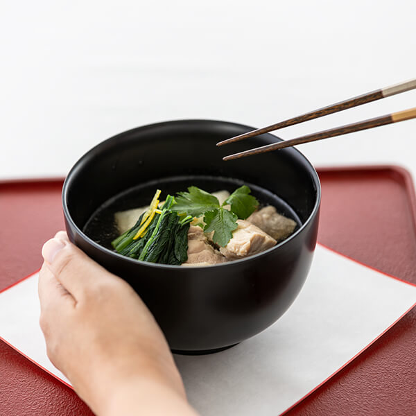 食洗器対応の大きめな汁椀。栗原はるみも子どものころから慣れ親しんでいる、艶消しの漆塗りで仕上げました。全体に重厚感を感じる厚みがありながら、縁にかけて薄くなっていて、口当たりが良いのが特徴。程よい深さがあり、丼ものや麺の器、お正月には雑煮椀として、様々なシーンで活躍します。※漆塗の特性上、1点ずつ色や表情が異なります。※変色、変形、塗装の剥がれの原因となるため、長時間水などに浸けて放置しないでください。※画像中の小物、コーディネートアイテムは商品に含まれません。※商品画像は、光の当たり具合やパソコンなどの閲覧環境により、実際の色味と異なって見える場合がございます。 ブランド share with Kurihara harumi サイズ (約)径13.5×高さ8.5cm 容量 740ml 重量 約195g 素材 本体/木粉55%とメラミン樹脂の合成品:漆塗 原産国 日本 加熱機器使用可否 レンジ : ×オーブン : ×直火 : ×IH : ×食洗機 : ○※電子レンジは1000W以下、オーブンは250℃以下での使用可否表示 「share with Kurihara harumi」というブランドは、皆さまに愛される、楽しい暮らしを創造するブランドを目指しています。share withには、みなさまと色々なことを共有し、分かち合いたいという想いが込められています。share with Kurihara harumiの目的は、家族の絆から生まれる皆さまの幸せをそっとお手伝いすることであると思っています。お店に来ていただいたときに、ほんの少しでも新しい発見があったり、幸せな気持ちになって頂けたらとてもうれしく思います。 同シリーズ商品食洗機対応がうれしい、大きめな汁椀。丼ものや麺類、雑煮椀として、幅広くお使いいただけます。 重厚感のある厚みながら、縁にかけて薄くなり、口当たりがよいのが特徴です。 同シリーズには、お好み椀と布袋椀の2種類を古代朱、黒の2色でご用意しました。(各種別売り。本品はお好み椀 黒。) ご注文前に ご注文をいただく前に、返品や配送、お支払い、手数料などについて必ずこちらでご確認ください。 ※商品の不良・破損などの場合を除き、原則として商品の返品、交換はお受けしておりません。 ギフト包装 リボン包装、熨斗包装、簡易包装などについて、詳しくはこちらでご案内しております。