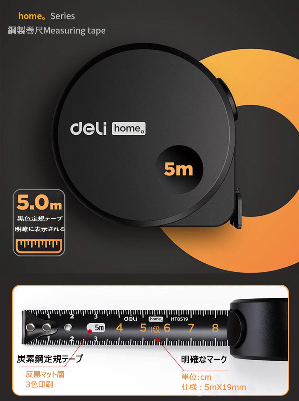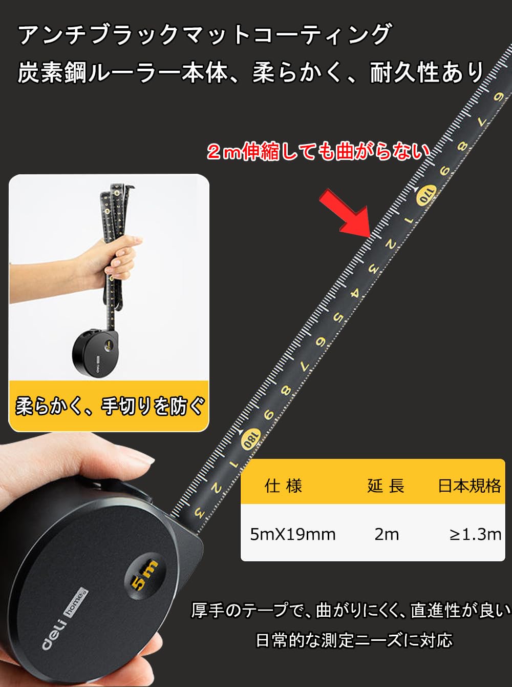 DELI メジャー 5m メジャー·巻き尺 高品位炭素鋼製 明確なマークと2mまで延長可能 水と錆に強い テープのエッジは手を切らないように不動態化されています (ブラック)