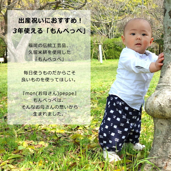 【商品名】 もんぺっぺ 出産祝い 男の子 女の子 久留米絣 綿 100% 日本製 ギフト こども もんぺ ベビー 赤ちゃん ズボン パンツ ぶるま コットン おしゃれ かわいい お祝い 内祝い青 紺 ネイビー グレー 水玉 赤 プレゼント 【サイズ】 総丈(ウエストから裾まで): 32cm ウエスト: 36〜58cm 適応身長:70〜100cm 0歳〜3歳頃までご着用いただきます。 【素材】 綿(久留米絣)100% 【色】 紺アラレ×井桁、グレー小白玉、大玉ブルー、紅玉 ≪柄の出方について≫ 裁断により掲載写真と柄の出方が異なる場合がございます。あらかじめご了承ください。 【商品番号】 u2303001 【備考】 モニターの発色具合によって、色が実際のものと相違する場合がございます。摩擦により他の製品に色移りする事があります。濡れた状態での摩擦には特にご注意ください。裁断により掲載写真と柄の出方が異なる場合がございます。あらかじめご了承ください。基本的には商品の返品・交換はできません。(不良品を除く)詳しくは返品・交換についてをご確認下さい。 お母様の訪問着レンタルはこちら >出産祝いにおすすめ!3年使える「もんぺっぺ」 福岡の伝統工芸品・久留米絣を使用した「もんぺっぺ」 毎日使うものだからこそ、良いものを使ってほしい。 『mon(お母さん)peppe』もんぺっぺは、そんなお母さんの想いから生まれました。 「寝返りを始める頃から歩けるようになるまで」 久留米絣パンツ「もんぺっぺ」は、0〜3歳頃までご着用いただけます! ウエストと裾口にはゴム通し口があり、ゴムの調整ができます。 お子様の成長とともにウエストと裾のゴムを緩めてあげてください。 大きくなるとハーフパンツとして利用して頂けます。 ≪ゴロゴロ期≫ 体温が高く、寝んねの多い赤ちゃんも快適に過ごせます。 ≪おすわり〜ハイハイ期≫ 足を大きく広げても動きやすいです。 ≪あんよ期≫ 裾が絞られ安全でお子様の動きを邪魔しません。 もっと大きくなると裾のゴムを抜いてハーフパンツとしてお使いください。 柔らかで優しい久留米絣は、デリケートな赤ちゃんのお肌をやさしく包んでくれます。 丈夫で使うほどに柔らかくなり、濡れても乾きやすい久留米絣。 丈夫で風通しが良く、汗っかきでよく動き回るお子様にぴったりです。 <久留米絣について> 200余年の歴史ある久留米絣。 麻の小千谷縮・越後上布・絹の結城紬についで、木綿としては唯一の重要無形文化財に指定されています。 反物が出来上がるまでには30以上の工程があり、そのひとつひとつに熟練の技が欠かかせません。 その為一反の久留米絣が出来上がるまでに最低3ヶ月の月日が必要となります。 現在では着物だけではなく『クラシカルだけどモダン』なテキスタイルとして注目されています。 素朴で愛らしく、伝統的な模様の反物を使用した「もんぺっぺ」 オリジナルボックスに入っているのでギフトにもおすすめです。 出産祝い・100日祝い・1才の誕生日のプレゼントなどにもいかがでしょうか? もんぺ ズボン パンツ ぶるま 出産祝い 男の子 服 女の子 日本製 ギフト こども ベビー キッズ 赤ちゃん もんぺっぺ 久留米絣 子供 綿 100% コットン おしゃれ かわいい 春 夏 秋 冬 お祝い 内祝い 青 紺 ネイビー グレー 赤 水玉 プレゼント この商品は翌日配送対象商品です最短配送をご希望の場合は【日付指定】が必須となります。 ・平日14時までに入金確認ができたご注文が対象です。 (土曜・日曜・祝日を除く) ・本州・四国(鳥取・島根・山口の除く)が対象です。 (北海道・九州・沖縄・一部離島山間部を除く) ・クレジットカード決済のみ対象です。 ・配送方法はゆうパック(日本郵便)です。 ゆうパケット等その他の配送方法の場合には対象外となります。 ※必ずお届け日付指定をお願い致します。 ※【翌日配送対象】以外の商品と同時にご注文を頂いた場合には、それぞれ別送をさせて頂きます。 →商品名に【翌日配送対象】と表示されている商品のみが該当致します。 ※決済不備や入金確認できていない場合は対象外です。 ※天候や交通状況により遅延が発生する場合がございます。 ※ご注文後すぐに出荷の手配に入りますので、ご注文後のキャンセルやご注文内容の変更、お客様情報の変更を承ることができません。 ※置き配への変更・日時変更・住所変更・ご自宅以外への配達の変更は、出荷後にお客様より配送会社に連絡をした場合に限り、変更可能な場合がございます。br>