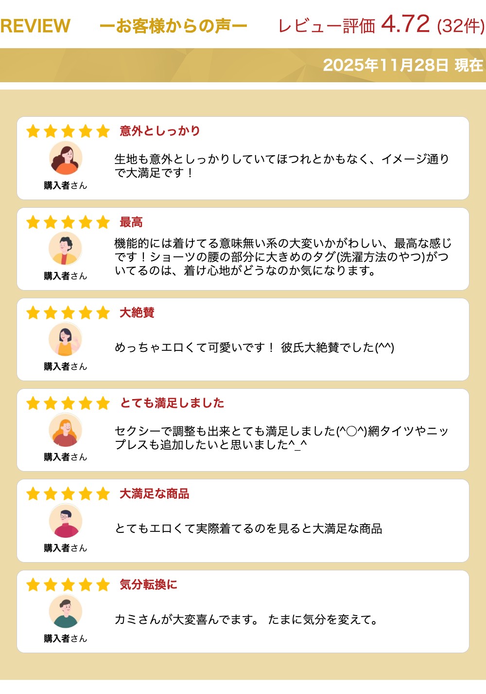 通常1〜4日以内の発送 最強翌日配送ご希望の方は【宅配便】+【日付指定】が必須です。 商品詳細説明 中身の見えない配達袋に入れて[洋服]という表示でメール便にて発送致します。お急ぎの方は宅急便にご変更ください。★商品概要★【品番】 w710【サイズ】フリーサイズ(M-L相当)F:アンダーライン:60-75cm(紐で結ぶタイプなので調節できます) ガーターベルトウエスト:60-88cm注意:平置き採寸のため誤差がございます。【カラー】ブラック注意:PCモニター設定や部屋の照明により多少、色の変化が感じられる場合がございます。◯ 商品内容 (1)オープンブラ(2)オープンクロッチショーツ(3)ガーターベルト(4)チョーカー注意:ストッキングとニップレスは付属いたしません。別売りです。ストッキング商品番号【s11】 ニップレス商品番号【k2】 商品説明 超過激なデザインのセクシーランジェリーをお探しの方にピッタリのアイテム。「ガーターベルト」のセットです。ブラは透け透けのオープンブラです。バックはゴムタイプの紐で長さが調節できます。ワイヤー無しで締め付けず着心地抜群。ガーターベルトは伸縮性がございます。レディースショーツは股割れのオープンショーツです。穴あきの可愛い紐パンなので、ほかのランジェリーとも相性抜群。スケスケのシースルータイプで、とてもセクシーです。素敵なレースで上品に見せるガーターベルトセット。プレゼントやイベントにも最適で特別な夜を彩ります。 自分らしくかわいく YY&YY ◇当店ではセクシーランジェリーやコスプレ衣装を豊富に取り揃えています。個性を引き立てる魅力的なデザインと、質の高い素材を使用した商品をリーズナブルな価格でご提供。特別な日やイベントにぴったりなコスプレ衣装はもちろん、普段使いできるセクシーランジェリーもご用意しています。大人の魅力を引き出すアイテムを見つけて、特別な瞬間を演出してください。◇レディースファッションアイテムも取り扱っています。デザイン、シルエット、素材にこだわったアイテムをお手頃価格でお届け。忙しい毎日でもおしゃれを楽しみたい方にぴったりなアイテムを提供しています。シンプルなブラウス、流行のミニスカート、上品なミモレスカート、カジュアルなロングパンツやショートパンツ、洗練されたワンピース…など、多彩なアイテムが盛りだくさん!>>ファッションアイテムをチェックするぜひ当店のラインナップをご覧ください♥ 検索用 #セクシーランジェリー #可愛いセクシーランジェリー#セクシーランジェリ 過激 #セクシーランジェリ 過激 大きいサイズ #セクシー コスチューム 過激 #セクシー コスチューム #セクシー ルームウェア #セクシーショーツ レディース#下着 大きいサイズ #ベビードール 大きいサイズ #レディースショーツ大きいサイズ #ストッキング 大きいサイズ #エロい下着 #穴あき下着 #股割れ #ボディコン #過激 #レディースショーツ Tバック #可愛いベビードール #紐パン 可愛い #キャミソール 部屋着 #大きいサイズ #上下セット #ぽっちゃり #XL #3L #4L #グラマー #プラスサイズ #プレイスーツ #ガーターストッキング #ガーターベルトストッキング #スケスケワンピース #ボディストッキング #全身タイツセクシー #オープンブラ #オープンショーツ #セクシーコスプレ #メイド服 #エロいコスプレ #セーラー服コスプレ #学生服コスプレ #チャイナ服コスプレ #チャイナドレスコスプレ #エロ #大人 #通販 #専門店 #ギフト #贈り物通常1〜4日以内の発送 最強翌日配送ご希望の方は【宅配便】+【日付指定】が必須です。 商品詳細説明 中身の見えない配達袋に入れて[洋服]という表示でメール便にて発送致します。お急ぎの方は宅急便にご変更ください。★商品概要★【品番】 w710【サイズ】フリーサイズ(M-L相当)F:アンダーライン:60-75cm(紐で結ぶタイプなので調節できます) ガーターベルトウエスト:60-88cm注意:平置き採寸のため誤差がございます。【カラー】ブラック注意:PCモニター設定や部屋の照明により多少、色の変化が感じられる場合がございます。◯ 商品内容 (1)オープンブラ(2)オープンクロッチショーツ(3)ガーターベルト(4)チョーカー注意:ストッキングとニップレスは付属いたしません。別売りです。ストッキング商品番号【s11】 ニップレス商品番号【k2】 商品説明 超過激なデザインのセクシーランジェリーをお探しの方にピッタリのアイテム。「ガーターベルト」のセットです。ブラは透け透けのオープンブラです。バックはゴムタイプの紐で長さが調節できます。ワイヤー無しで締め付けず着心地抜群。ガーターベルトは伸縮性がございます。レディースショーツは股割れのオープンショーツです。穴あきの可愛い紐パンなので、ほかのランジェリーとも相性抜群。スケスケのシースルータイプで、とてもセクシーです。素敵なレースで上品に見せるガーターベルトセット。プレゼントやイベントにも最適で特別な夜を彩ります。 自分らしくかわいく YY&YY ◇当
