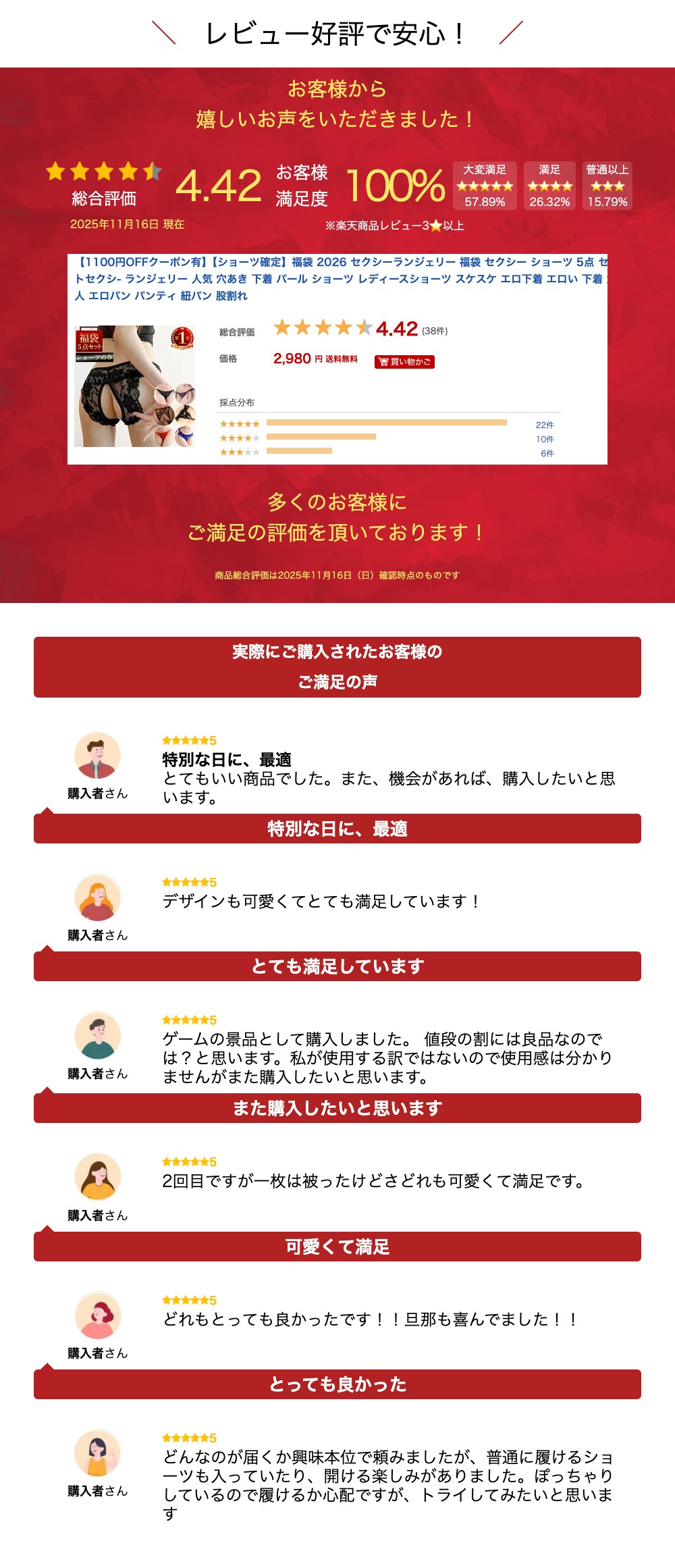 通常1〜4日以内の発送 最強翌日配送ご希望の方は【宅配便】+【日付指定】が必須です。 商品詳細説明 中身の見えない配達袋に入れて[洋服]という表示でメール便にて発送致します。お急ぎの方は宅配便にご変更ください。 ★商品概要★【品番】lk5注意:PCモニター設定や部屋の照明により多少、色の変化が感じられる場合がございます。★中身の見えない配達袋に入れて[洋服]という表示でメール便にて発送致します。お急ぎの方は宅配便にご変更ください。★商品内容 人気商品確約。ショーツ5点セット福袋★注意事項1.それぞれの商品はお選びいただけませんので、ご了承ください。2.商品のサイズはフリーサイズ(M-L相当)です。3.福袋の中身が重複することはございませんが、他の福袋を複数ご購入いただくと同じ商品が被ってしまう可能性がございます。4.イベントセール品のため初期不良以外(サイズやイメージ違いなど)の理由では返品・交換できかねます。5.ご注文確定後の変更・キャンセルはお受けすることができません。 自分らしくかわいく YY&YY ◇当店ではセクシーランジェリーやコスプレ衣装を豊富に取り揃えています。個性を引き立てる魅力的なデザインと、質の高い素材を使用した商品をリーズナブルな価格でご提供。特別な日やイベントにぴったりなコスプレ衣装はもちろん、普段使いできるセクシーランジェリーもご用意しています。大人の魅力を引き出すアイテムを見つけて、特別な瞬間を演出してください。◇レディースファッションアイテムも取り扱っています。デザイン、シルエット、素材にこだわったアイテムをお手頃価格でお届け。忙しい毎日でもおしゃれを楽しみたい方にぴったりなアイテムを提供しています。シンプルなブラウス、流行のミニスカート、上品なミモレスカート、カジュアルなロングパンツやショートパンツ、洗練されたワンピース…など、多彩なアイテムが盛りだくさん!>>ファッションアイテムをチェックするぜひ当店のラインナップをご覧ください♥ 検索用 #セクシーランジェリー #可愛いセクシーランジェリー#セクシーランジェリ 過激 #セクシーランジェリ 過激 大きいサイズ #セクシー コスチューム 過激 #セクシー コスチューム #セクシー ルームウェア #セクシーショーツ レディース#下着 大きいサイズ #ベビードール 大きいサイズ #レディースショーツ大きいサイズ #ストッキング 大きいサイズ #エロい下着 #穴あき下着 #股割れ #ボディコン #過激 #レディースショーツ Tバック #可愛いベビードール #紐パン 可愛い #キャミソール 部屋着 #大きいサイズ #上下セット #ぽっちゃり #XL #3L #4L #グラマー #プラスサイズ #プレイスーツ #ガーターストッキング #ガーターベルトストッキング #スケスケワンピース #ボディストッキング #全身タイツセクシー #オープンブラ #オープンショーツ #セクシーコスプレ #メイド服 #エロいコスプレ #セーラー服コスプレ #学生服コスプレ #チャイナ服コスプレ #チャイナドレスコスプレ #エロ #大人 #通販 #専門店 #ギフト #贈り物通常1〜4日以内の発送 最強翌日配送ご希望の方は【宅配便】+【日付指定】が必須です。 商品詳細説明 中身の見えない配達袋に入れて[洋服]という表示でメール便にて発送致します。お急ぎの方は宅配便にご変更ください。 ★商品概要★【品番】lk5注意:PCモニター設定や部屋の照明により多少、色の変化が感じられる場合がございます。★中身の見えない配達袋に入れて[洋服]という表示でメール便にて発送致します。お急ぎの方は宅配便にご変更ください。★商品内容 人気商品確約。ショーツ5点セット福袋★注意事項1.それぞれの商品はお選びいただけませんので、ご了承ください。2.商品のサイズはフリーサイズ(M-L相当)です。3.福袋の中身が重複することはございませんが、他の福袋を複数ご購入いただくと同じ商品が被ってしまう可能性がございます。4.イベントセール品のため初期不良以外(サイズやイメージ違いなど)の理由では返品・交換できかねます。5.ご注文確定後の変更・キャンセルはお受けすることができません。 自分らしくかわいく YY&YY ◇当店ではセクシーランジェリーやコスプレ衣装を豊富に取り揃えています。個性を引き立てる魅力的なデザインと、質の高い素材を使用した商品をリーズナブルな価格でご提供。特別な日やイベントにぴったりなコスプレ衣装はもちろん、普段使いできるセクシーランジェリーもご用意しています。大人の魅力を引き出すアイテムを見つけて、特別な瞬間を演出してください。◇レディースファッションアイテムも取り扱っています。デザイン、シルエット、素材にこだわったアイテムをお手頃価格でお届け。忙しい毎日でもおしゃれを楽しみたい方にぴったりなアイテムを提供しています。シンプルなブラウス、流行のミニスカート、上品なミモレスカート、カジュアルなロングパンツやショートパンツ、洗練されたワンピース…など、多彩なアイテムが盛りだくさ