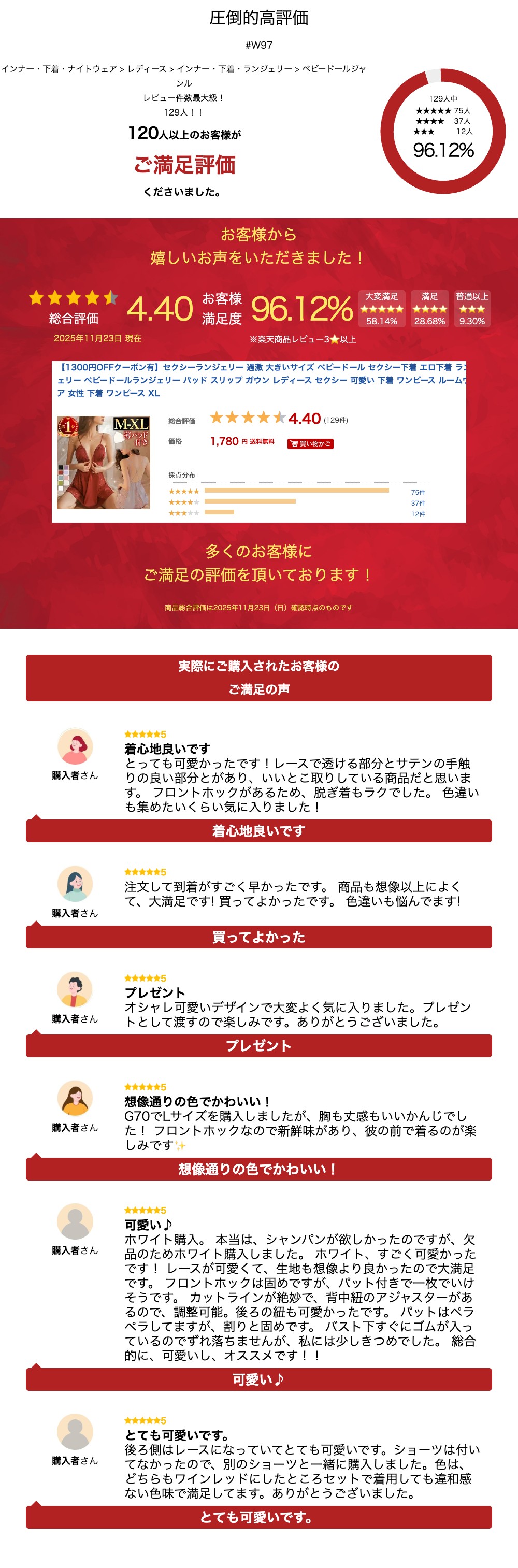 通常1〜4日以内の発送 最強翌日配送ご希望の方は【宅配便】+【日付指定】が必須です。 ★中身の見えない段ボールか配達袋に入れて【洋服】という表記でメール便で発送いたします。お急ぎの方は宅配便にご変更ください。宅配便でも3980円以上でしたら送料無料となります。 ◯商品概要 サイズ M: 着丈(肩紐含まず):66cm アンダー:64cm ウエスト:70cm 目安体重:40−55kg L: 着丈(肩紐含まず):67cm アンダー:70cm ウエスト:76cm 目安体重:55−60kg XL: 着丈(肩紐含まず):69cm アンダー:76cm ウエスト:80cm 目安体重:60−70kg カラー ブラック・ホワイト・ワインレッド・ローズゴールド・アッシュパープル・パープル・スカイブルー・モスグリーン・シャンパン※ご覧の端末により色味が多少異なる場合があります。 品番 w97 商品内容 ベビードール(単品)※ガウン・小物等は付属いたしません ◯特徴 柔らかい素材感 肌触りよく快適に着用可能。ほんのり光沢で高級感抜群。 美しいシルエット 透けレースとサテン風生地の切り返しで華奢見え効果。チラ見え素肌でセクシー度アップ。 極薄パッド入り 取り出せるパッドで胸元の透け防止。さらにフロントホックで着脱も楽ちん。 プレゼントにも最適 シンプルでエレガントな見た目で特別な夜やイベントを彩る一枚に。 商品説明 セクシーランジェリーを求める大人の女性におすすめのベビードールランジェリー。繊細なレースと軽やかな透け感が美しいデザインで、程よく肌を見せながら上品で過激な印象を演出します。胸元にはパッド付きで透け防止に。ふんわりと広がるシルエットがボディを優しく包み込み、大きいサイズ(XL)にも対応しているので快適な着心地。部屋着としても人気が高く、特別な夜の演出や自分磨きにもぴったり。セクシーさと可愛らしさを兼ね備えたランジェリーで、自信と魅力を引き出す一着です。 自分らしくかわいく YY&YY ◇当店ではセクシーランジェリーやコスプレ衣装を豊富に取り揃えています。個性を引き立てる魅力的なデザインと、質の高い素材を使用した商品をリーズナブルな価格でご提供。特別な日やイベントにぴったりなコスプレ衣装はもちろん、普段使いできるセクシーランジェリーもご用意しています。大人の魅力を引き出すアイテムを見つけて、特別な瞬間を演出してください。◇レディースファッションアイテムも取り扱っています。デザイン、シルエット、素材にこだわったアイテムをお手頃価格でお届け。忙しい毎日でもおしゃれを楽しみたい方にぴったりなアイテムを提供しています。シンプルなブラウス、流行のミニスカート、上品なミモレスカート、カジュアルなロングパンツやショートパンツ、洗練されたワンピース…など、多彩なアイテムが盛りだくさん!>>ファッションアイテムをチェックするぜひ当店のラインナップをご覧ください♥ 検索用 #セクシーランジェリー #可愛いセクシーランジェリー#セクシーランジェリ 過激 #セクシーランジェリ 過激 大きいサイズ #セクシー コスチューム 過激 #セクシー コスチューム #セクシー ルームウェア #セクシーショーツ レディース#下着 大きいサイズ #ベビードール 大きいサイズ #レディースショーツ大きいサイズ #ストッキング 大きいサイズ #エロい下着 #穴あき下着 #股割れ #ボディコン #過激 #レディースショーツ Tバック #可愛いベビードール #紐パン 可愛い #キャミソール 部屋着 #大きいサイズ #上下セット #ぽっちゃり #XL #3L #4L #グラマー #プラスサイズ #プレイスーツ #ガーターストッキング #ガーターベルトストッキング #スケスケワンピース #ボディストッキング #全身タイツセクシー #オープンブラ #オープンショーツ #セクシーコスプレ #メイド服 #エロいコスプレ #セーラー服コスプレ #学生服コスプレ #チャイナ服コスプレ #チャイナドレスコスプレ #エロ #大人 #通販 #専門店 #ギフト #贈り物通常1〜4日以内の発送 最強翌日配送ご希望の方は【宅配便】+【日付指定】が必須です。 ★中身の見えない段ボールか配達袋に入れて【洋服】という表記でメール便で発送いたします。お急ぎの方は宅配便にご変更ください。宅配便でも3980円以上でしたら送料無料となります。 ◯商品概要 サイズ M: 着丈(肩紐含まず):66cm アンダー:64cm ウエスト:70cm 目安体重:40−55kg L: 着丈(肩紐含まず):67cm アンダー:70cm ウエスト:76cm 目安体重:55−60kg XL: 着丈(肩紐含まず):69cm アンダー:76cm ウエスト:80cm 目安体重:60−70kg カラー ブラック・ホワイト・ワインレッド・ローズゴールド・アッシュパープル・パープル・スカイブルー・モスグリーン・シャンパン※ご覧の端末により色味が多少異なる場合があります。 品番 w97 商品内容 ベビードール(単品)※ガウン・小物等は付属いたしません ◯特徴 柔らかい素材感 肌触りよく快適に着用可能。ほんのり光沢で高級感抜群。 美しいシルエット 透けレースとサテン風生地の切り返しで華奢見え効果。チラ見え素肌でセクシー度アップ。 極薄パッド入り 取り出せるパッドで胸元の