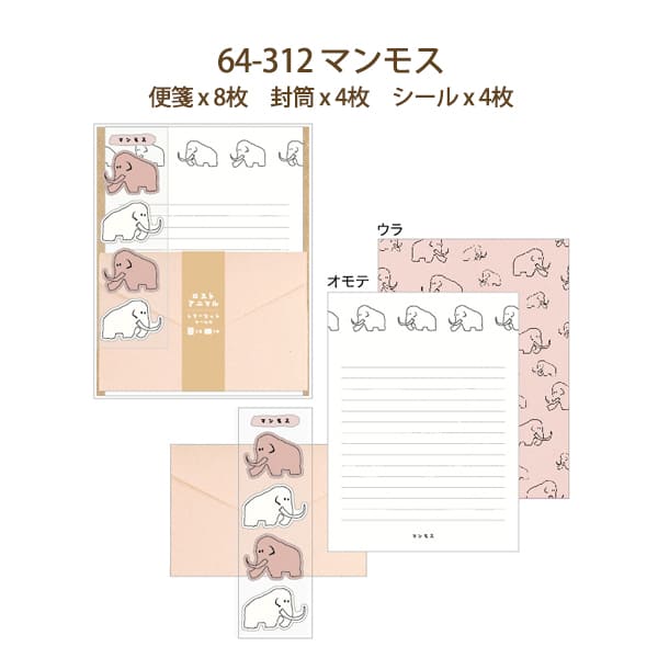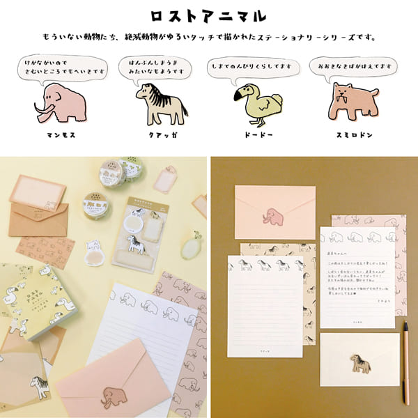 【4個までネコポス対応】 ロストアニマルシリーズ もういない動物たち、絶滅動物がゆるいタッチで描かれたステーショナリーシリーズです。 商品レターセット(便箋:8枚、封筒:4枚、シール:4枚) サイズ便箋:190mm × 140mm封筒:100mm × 150mmパッケージ:195mm × 160mm 重さ48g デザイン64-312:マンモス64-313:クアッガ64-314:ドードー64-315:スミロドン