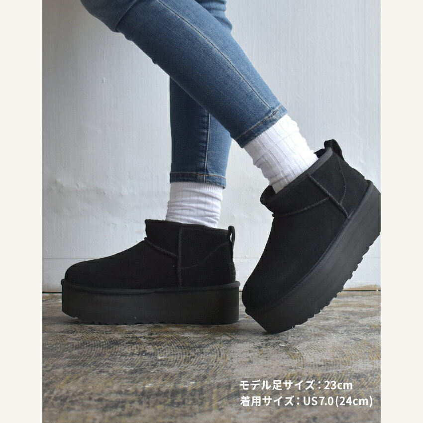 《アイテム名》 アグ ブーツ UGG レディース CLASSIC ULTRA MINI PLATFORM 1135092 《ブランドヒストリー》 【UGG】1978年、オーストラリアのサーファー、Brian Smith(ブライアン・スミス)によって立ち上げられたUGG AUSTRALIA(アグ オーストラリア)。USサーフマーケットにおけるシープスキンブーツの地盤を確立。以来、短期的サーフブランドではなく、ラグジュアリーなシープスキンフットウエアの世界的なブランドへと成長を遂げた人気ブランドです。 《アイテム説明》 アグより「CLASSIC ULTRA MINI PLATFORM」です。約5cmのプラットフォームソールを搭載したCLASSIC ULTRA MINI PLATFORM(クラシック ウルトラ ミニ プラットフォーム)。CLASSIC ULTRA MINIと同じスエードに加え、UGGのシグネチャーであるUGGplushウールブレンドのライニングが施され、厚底ソールでもクッション性が高く、ソフトな履き心地が特徴です。 《カラー名/カラーコード/管理No.》 01.ブラック/BLK/"12620030" 02.チェスナット/CHE/"12620031" 03.サンド/SAN/"12620032" 04.チャコール/CHRC/"12620033" こちらの商品は、並行輸入により海外から輸入しております。製造・入荷時期により、細かい仕様の変更がある場合がございます。上記を予めご理解の上、お買い求め下さいませ。 関連ワード: シューズ ムートン ムートンブーツ 靴 ブランド ロゴ カジュアル シンプル ナチュラル シンプル 厚底 暖かい 冬 保温 防寒 おしゃれ プレゼント ギフト クッション性 ブラウン 茶 グレー date 2022/11/01 ブランド名UGG商品名CLASSIC ULTRA MINI PLATFORM原産国Vietnam 他比較対照価格ブランド公式サイト掲載価格(税込)27,500円比較対照確認方法ブランド公式サイト比較対照価格確認日2025年09月12日型番1135092商品に関する注意点本製品は並行輸入品となります。比較対照商品との相違点正規販売店の発行する製品保証対象外です。広告文責本表の内容は当店責任において確認したものです。※当店記載の「当店通常価格」は、消費者庁及び楽天市場が示す、価格表示・割引表示についてのガイドラインに従い、表示しております。Item Spec ブランドUGG アグアイテムブーツスタイルNo1135092商品名CLASSIC ULTRA MINI PLATFORM性別レディース原産国Vietnam、Philippines 他素材アッパー:スエードライニング:17mmのUGGplush(アップサイクルウール 80% / リヨセル 20%)インソール:17mmのUGGplush(アップサイクルウール 80% / リヨセル 20%)重量片足:US6(23cm) 約 366g商品特性1こちらの商品は1cm刻みの展開となります。商品特性2アッパーには天然皮革を使用しています。その為、シワ・キズ・色むらが散見されますが不良品ではございません。天然素材特有の質感、味わいをお楽しみ頂ければ幸いです。商品特性3UGG製品を御購入に関する諸注意及び、セキュリティータグに関するご注意はコチラからご確認下さい。※ご購入前に必ずお読みください。着用時のサイズ感細身、普通の方標準サイズ甲高、幅広の方1サイズ大きめ筒丈約 8.5 cmヒール高約 5 cm履き口周り約 33 cm足首周り約 34 cmこちらのアイテムの足入れは標準です。採寸・着用に使用したサイズ【US6】※上記サイズ感は、スタッフが実際に同一の商品を着用した結果です。スタッフ着用の為、個人差があります。参考としてご確認ください。サイズについて詳しくはこちらをご覧下さい。当店では、スタジオでストロボを使用して撮影しております。商品画像はできる限り実物を再現するよう心掛けておりますが、ご利用のモニターや環境等により、実際の色見と異なる場合がございます。ご理解の上、ご購入いただけますようお願いいたします。▲その他アイテムはこちら >