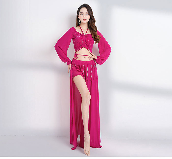 ベリーダンス 衣装 レッスン着 セットアップ 星屑 キラキラ おしゃれ ベリーダンス衣装 発表会 衣装 長袖 チョリ トップス Vネック スリットオーバー スパンコール フリンジ付きスカート ロング丈 ベリーダンス 衣装セット ピンク ブラック グリーン