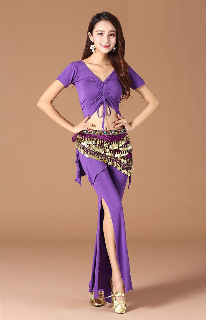 ベリーダンス 衣装 セット レッスン着 セットアップ スカート風 ロング丈 パンツ スリット入り Vネック トップス ストレッチ 動きやすい伸縮生地 おしゃれ ダンス衣装 ステージ衣装 ダンス 発表会 上下セット ブラック パープル