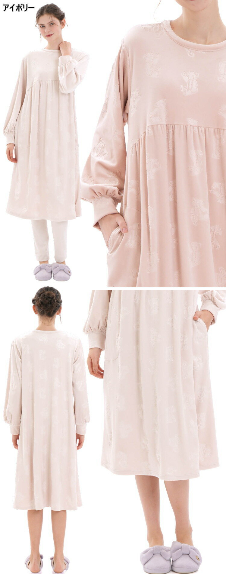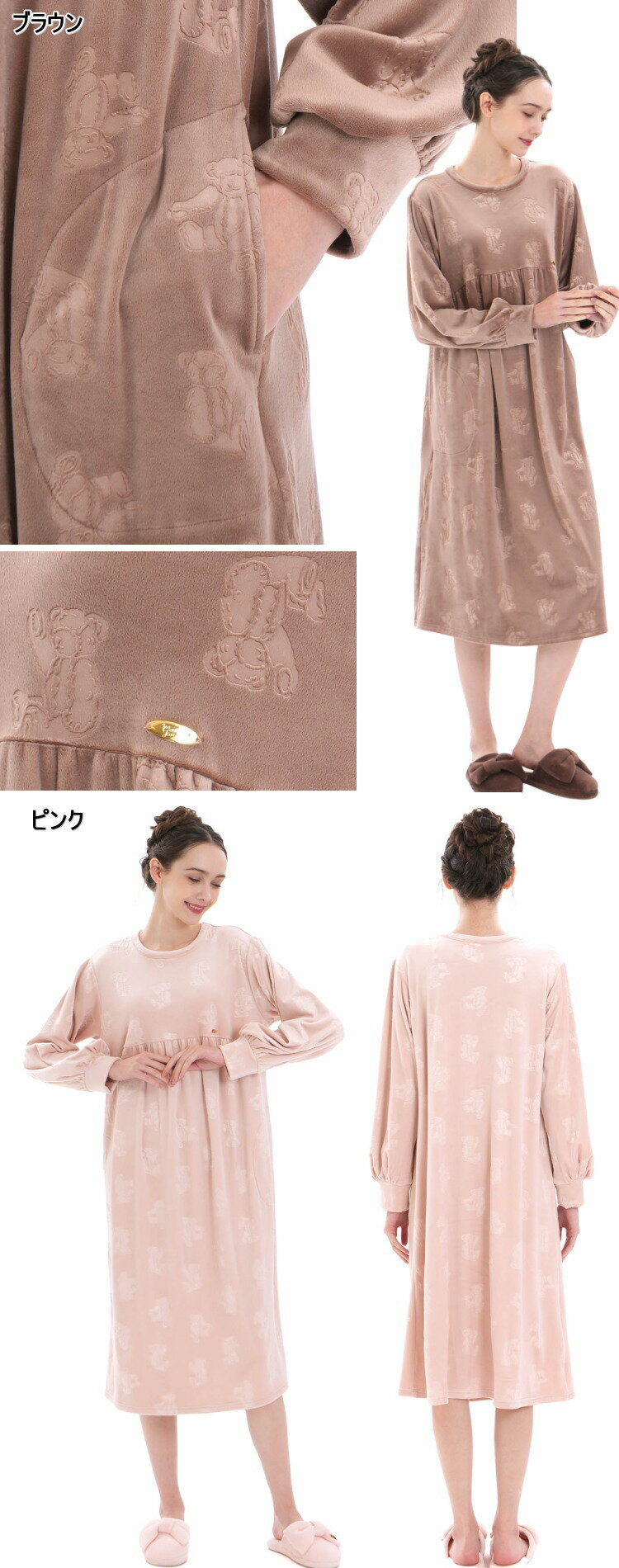 ナルエー ワンピース スノースムージーエンボステディーベアワンピース ブラウン ピンク アイボリー M〜L 長袖ナイトウェア ネグリジェ ルームウェア 冬物 秋冬 暖か 保温性 かぶり 部屋着 寝巻 柔らか 速乾性 レディース Moon Tan narue お洒落 パジャマ プレゼント
