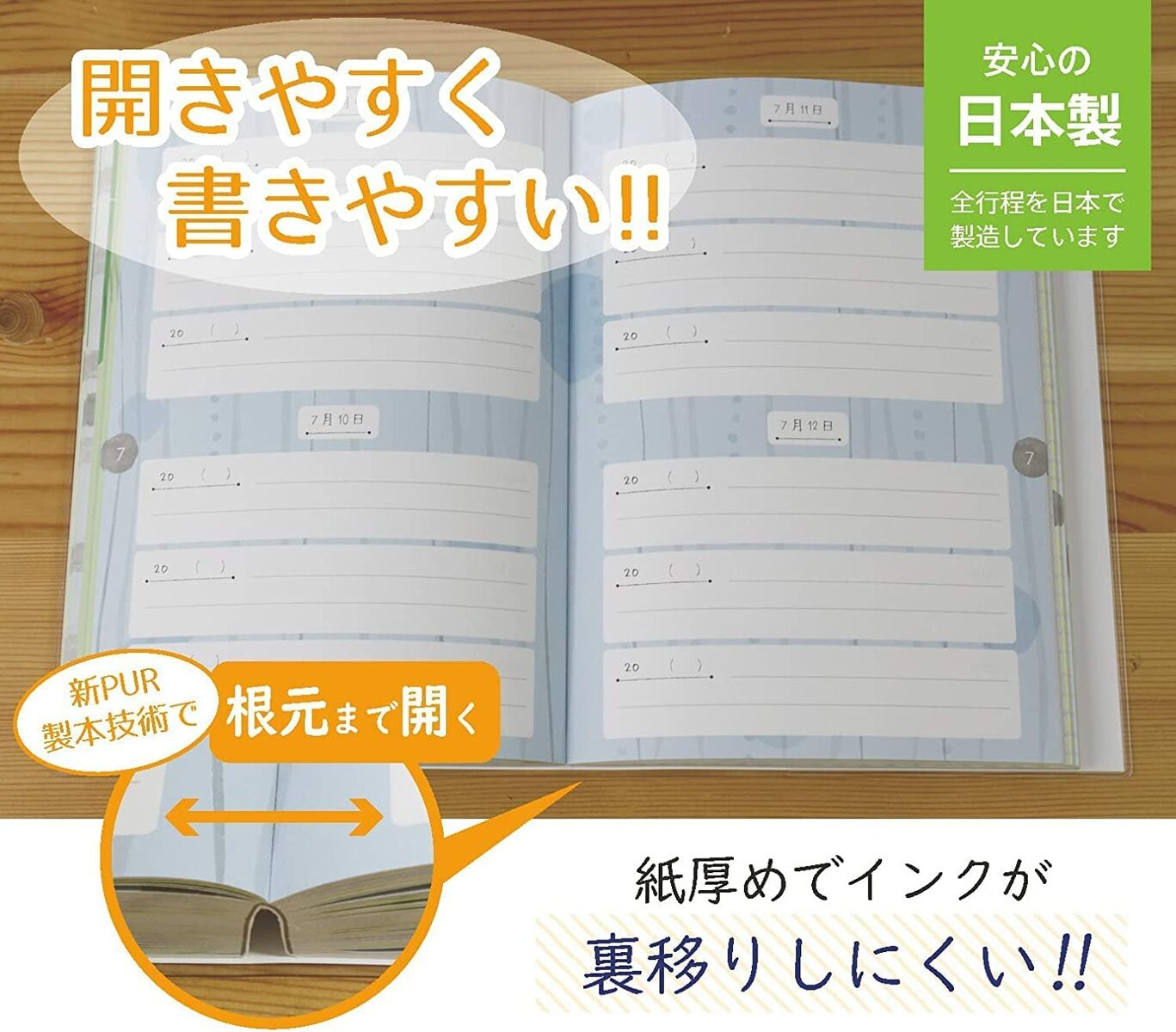商品情報 商品名ノートライフ 育児日記(うさぎ柄)3年連用 A5|しおり付き|全ページフルカラー|日本製 PRポイント ・専属デザイナー監修のやさしいデザイン。 ・新PUR製本で開きやすく書きやすい。 ・3年連用だから、同じ日の1年前・2年前と見比べられる。 ・日付印刷タイプでいつからでも始められる。 ・フルカラー/しおり付き/ビニールカバー仕様/日本製。 サイズ・仕様 A5(約21×15cm)/厚み:約17mm/約550g/全248ページ/上質紙/新PUR製本/ビニールカバー仕様/しおり1本 季節のおすすめ 出産祝い・お七夜・初節句・ハーフバースデー・1歳誕生日・入園準備・母の日・父の日・敬老の日・クリスマス・新年の書き初めに。 検索キーワード 育児日記 3年連用 日記帳 A5 ベビーダイアリー 育児ノート しおり付き フルカラー 日本製 ビニールカバー 日付記入式 いつからでも 記録 かわいい ノートライフ 出産祝い ギフト育児日記(うさぎ柄)A5・3年連用|しおり付き|フルカラー|日本製 専属デザイナー監修のやさしい配色。新PUR製本で開きやすく書きやすい。日付印刷タイプいつからでも始められます。 ポイント ・3年連用で、同じ日の1年前・2年前の記録と並べて振り返りOK ・全ページフルカラー/しおり付き/ビニールカバー仕様 ・日本製 仕様 サイズ:A5(約21×15cm)/厚み:約17mm/約550g ページ数:全248ページ/用紙:上質紙 製本:新PUR製本(開きやすい) 形式:3年連用 × 日付印刷タイプ(現在のページから始められる) カバー:ビニールカバー仕様/しおり付き 生産国:日本/ブランド:ノートライフ 季節のおすすめ 出産祝い・初節句・ハーフバースデー・1歳誕生日・入園準備・母の日・敬老の日・クリスマス・新年の書き初めに。 よくある質問 Q. いつからスタートしても大丈夫? A. 日付印刷タイプなので、思い立った日から始められます。 Q. 1年前の記録は見返せますか? A. 3年連用のため、同じ日の1年・2年前の記録と並べて振り返れます。