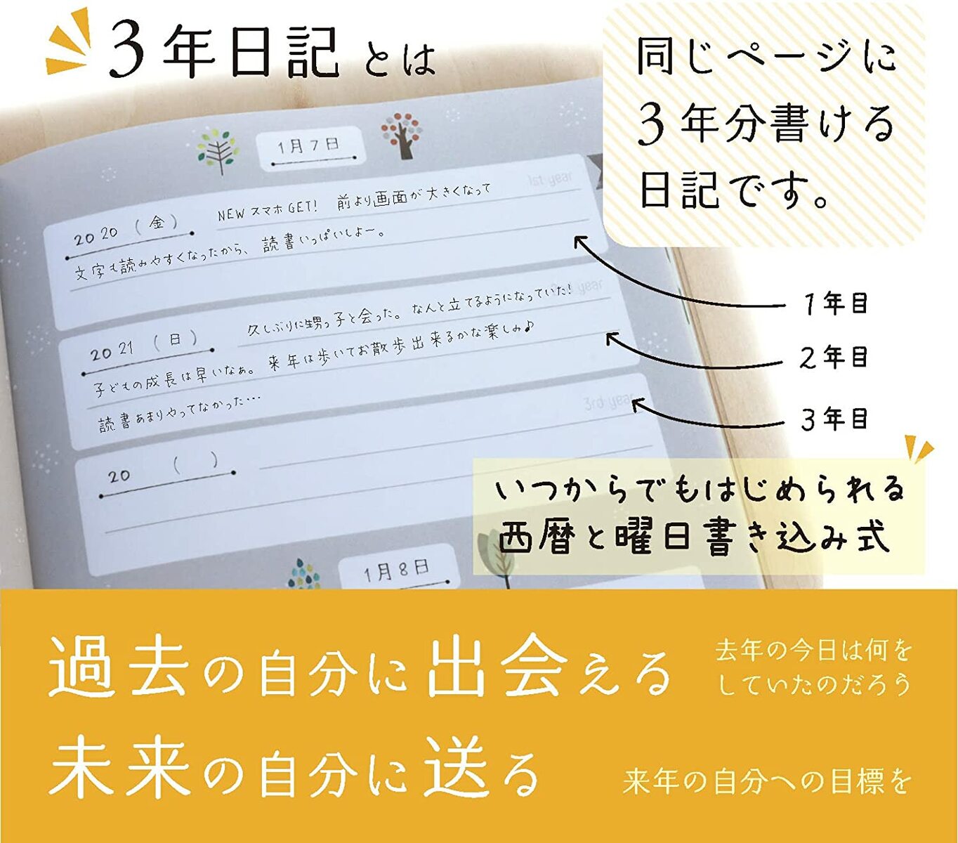 商品情報商品名ノートライフ 3年日記 日記帳 A5 フルカラー(21cm×15cm) 日本製 ソフトカバー 日付け表示あり(いつからでも始められる)サイズサイズ約 横150×縦210×幅20mm重量約500g材質■用紙:上質紙仕様■ 3年日記■ A5サイズ■ 全224ページ商品説明・【紙面】上質紙224ページ厚めの紙面を使用しています。・【サイズ】B5(25.7×18.2)通常ノートサイズ・いつからでもはじめられます。・過去の自分に出会えます。・新PUR製法で、日記が開きやすい仕様です。・ソフトカバーになります。・フルカラー、日本製検索キーワード3年日記 3年 日記帳 日記 3年 日誌 手帳 連用日記 育児日記 交換日記 3年連用ダイアリー かわいい 5年日記 10年日記 10年日記帳 5年日記帳 にっきちょう 家計簿 diaryこの商品は 日記 3年日記 日記帳 ノートライフ 日本製 3年 ノート 1年 5年 手帳 帳 2022 年 育児日記 交換日記 ダイアリー ソフトカバー 日付け表示あり (いつからでも始められる) ポイント日記 3年日記 日記帳 ダイアリー 三年 連用 A5 かわいい おしゃれ おすすめ 3年 ノート 育児日記 記録 お祝い 新生活 大人 家族 ギフト プレゼント 1年 5年 スケジュール 帳 2022 年 ↑↑上記の画像をクリックで日記帳をご確認頂けます。↑↑ B5 (26cm×18cm)、A5 (21cm×15cm)サイズの日記帳があります。紙面が方眼仕様の黒色、時計柄の日記、自由に書き込めるスタイルのねこ日記、木の絵柄がかわいい木の日記、人気のA5サイズ3年メモありますので是非ご確認下さい。しおりあり、なしも選べます。日記初心者に続けやすい 3年連用の日記帳 書き込みやすいB5サイズ癒しの木のデザインを採用させて頂き、紙面も癒しのデザインを採用しました。日記を始めるタイミングを自分で選べるので好きなタイミングで始められます。日付表示がありますので、日付を書かなくて良いのも地味に嬉しいポイント。1日3年分を一度に書き込めれて、3行ですので初心者にもおすすめです。開くと一昨年、去年の自分の 出来事を思い返すことができるのがとても楽しいです。育児日記や仕事の作業計画、家族日記、健康の管理帳にと、まさに十人十色。 いろいろな使い方が出来る日記帳です。※こちらの商品は3年日記になります。スケジュール帳ではございません。 ショップからのメッセージ ↑↑画像をクリックでお風呂ポスターを確認出来ます。↑↑お子様におすすめのお風呂学習ポスター、(うんちデザイン、ねこデザイン御座います)おしゃれな木目の日本地図、世界地図はいかがでしょうか?元素記号一覧表や理科の公式一覧表も御座います。店長のミズイです。ノートライフ商品の3年日記はいかがでしょうか?新PUR製本を採用していて、開きやすさ、書きやすさが特徴です!ノートライフの3年日記はデザインをAYUさんに依頼しており、木の日記はとてもかわいいデザインとなっています!もし宜しければご検討下さい。最後までお読み頂きましてありがとうございました。 納期について 4