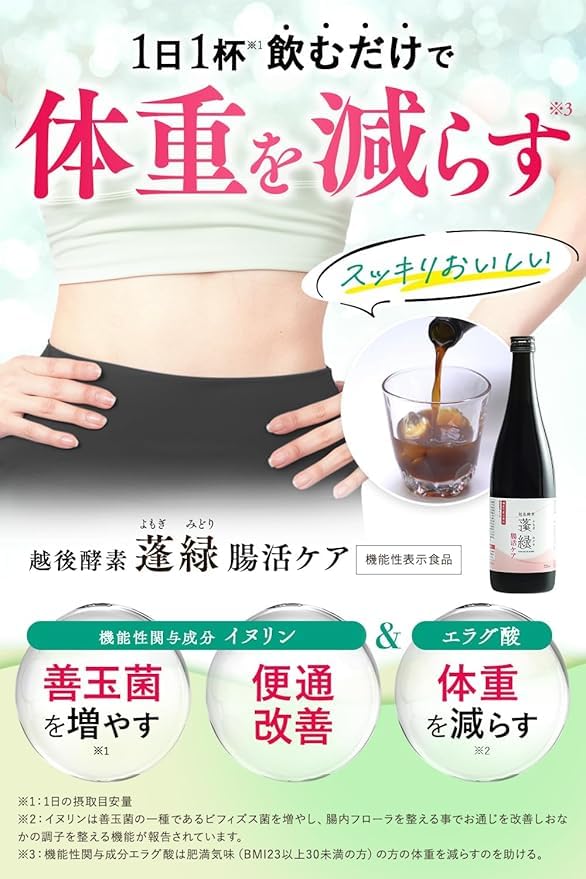 ◆商品名:越後酵素蓬緑 腸活ケア 720ml×2本 腸活 腸内環境を整える イヌリン エラグ酸【医科大学との20年の共同研究】 蓬緑は「本当に実感できる良い商品を」その一心で金沢医科大学名誉教授との20年の共同研究によって完成した"オリジナル酵素ドリンク"です。伝統の独自発酵技術で作られた酵素原液は日本成人病予防協会”の推奨品として認定されています。【あなたの"腸活"を徹底サポート】 80種類の厳選素材と3種の有用菌(乳酸菌・酵母菌・麹菌)を熟成発酵によってギューッと凝縮された酵素原液。そんな酵素原液に、”体重減少をサポート”する「エラグ酸」と”腸内環境を整える”「イヌリン」を配合した酵素ドリンクです。【善玉菌を増やして腸を整える】 機能性関与成分「イヌリン」が体内の善玉菌(ビフィズス菌)を増やし、腸内環境を整えます。【健康的な生活習慣をサポート】 機能性関与成分「エラグ酸」が体重、体脂肪、血中中性脂肪、ウエスト周囲径、内臓脂肪の減少をサポートし、高めのBMI値の改善を助けます。【大手百貨店でも大好評】 高島屋や伊勢丹など大手百貨店でも販売実績があり、おかげさまで累計販売実績「3億杯」を突破!多くの方々に愛されています。【おいしさ満足度99%】 おいしくスッキリ!甘くフルーティな味わいで子供から大人まで飲める!「毎日続けて欲しいから」味にも徹底的にこだわりました。今まで酵素ドリンクが苦手だった方からも「おいしくて飲みやすい」というお声を頂いております。【食品無添加物不使用】 甘味料・香料・着色料・保存料・白砂糖・化学調味料を一切使用しない無添加製法にこだわりました。 安心・安全・健康のために自然界本来の味わいをお楽しみいただけます。【お召し上がり方】 ・1日25mlをよく振ってお飲みください。 原料由来の沈殿物が生じる場合がありますが、品質には問題ありません。 ・ストレートでも美味しいとお声をいただいております。 また、お好みで水またはぬるま湯、あるいは牛乳や炭酸水などで3~4倍に薄めてお召し上がりいただここともおすすめです。 【使用上の注意】 体質・体調によりまれに合わない場合がありますので、その場合はご使用をお控えください。 疾病などで治療中のかたや妊娠中のかたがご使用になる場合は、事前に医師や薬剤師にご相談ください。
