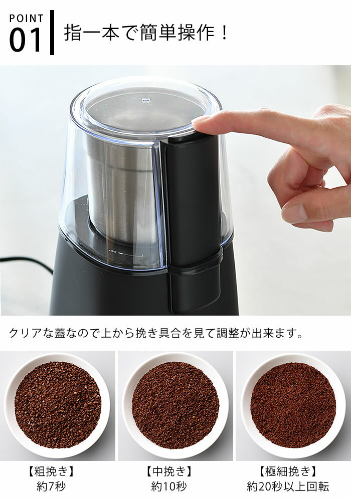 商品名コーヒーグラインダー ラッセルホブス商品詳細サイズ約 W12×D12×H21cm容量60g※一度に挽ける豆の最大量重量約1.1kg素材ステンレスAS樹脂電源/消費電力AC100V 50/60hz/150Wコード長さ1.3m保証期間1年備考※60g以上のコーヒー豆を入れないでください。※透明カバー(蓋)は水洗い可能です。※グラインディングボウルは水洗いできません。※掃除用のブラシがついています。検索キーワード コーヒーグラインダー Russell Hobbs ラッセルホブス コーヒーミル ステンレス刃 電動 グラインダー ミル 自動挽き コーヒー 豆 豆挽き キッチン家電 調理家電 シンプル おしゃれ ラッピングラッピングOK→詳細はこちらコーヒーグラインダー ラッセルホブス程よいサイズ感と簡単操作で使いやすい電動コーヒーグラインダーボタン一つで手軽にコーヒー豆が挽ける電動コーヒーグラインダー。ハイパワーモーターなので短時間で挽けます。だから時間のない朝でも挽きたてで美味しいコーヒーを味わっていただけます。挽き具合も上から見ながら調整が出来て便利!パーツの少なさからお手入れもしやすくブラシもついているのでブレード周りの細かい所の粉をキレイに集めて取ることができます。ラッセルホブスならではの見た目のスタイリッシュさに加え、電動なのにサイズがそれほど大きくなくコンパクトな所もポイントです。※透明の蓋カバーのみ水洗いが可能です。グラインディングボウルは水洗いできません。付属のブラシで細かいところをきれいにして最後にペーパーなどで拭き取り、外装部は湿らせた柔らかい布で拭いてお手入れする商品です。→シリーズ一覧を見る