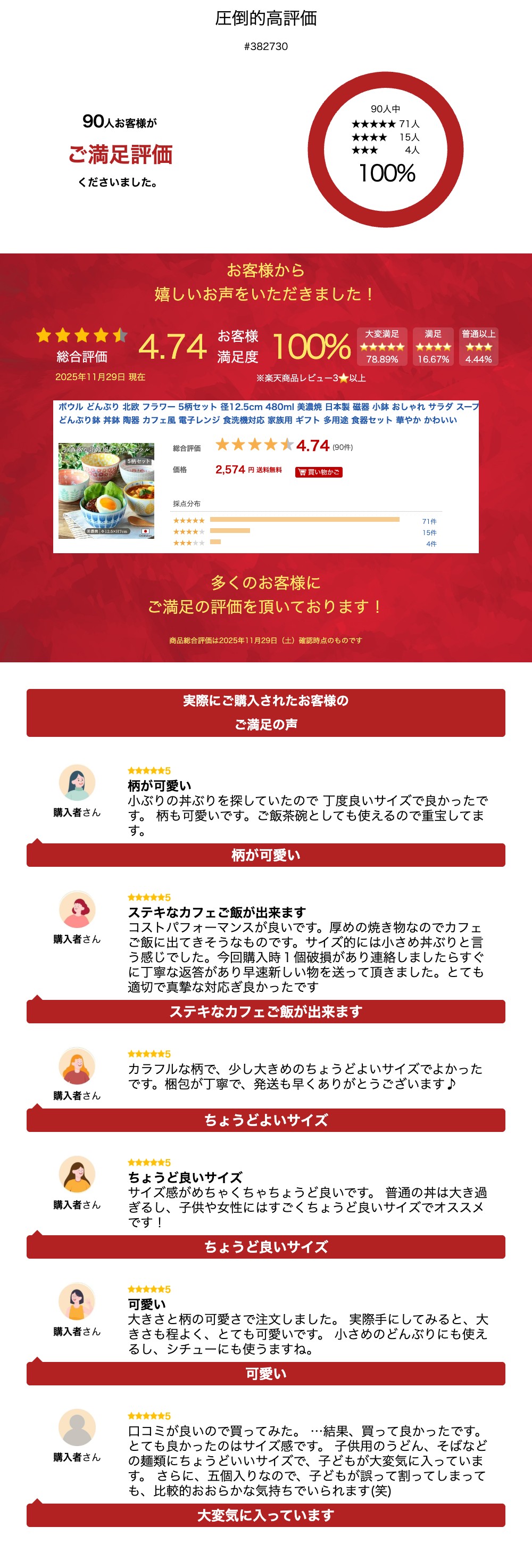 かわいさと実用性を備えた北欧風のフラワーボウル。シンプルなフォルムで使いやすい形状。カラーは色とりどりのマルチカラーで、内側&外側それぞれ異なったポップな柄を施し、“見て”、“食べて”食事が楽しくなる器です♪こちらのボウルは、480mlの容量でサラダや一品料理の盛り付けにぴったり!高さも約7cmあり深さがあるので、汁けのある料理やスープ系も盛り付けできます。小丼として、ミニカツ丼やミニうどんなどもいいですね♪他にも、ヨーグルトやフルーツなど食卓に何かプラス1品、添えるときにいかがですか?5柄組で家族でも使える嬉しいセット。お気に入りのカラーで毎日の食卓を明るく華やかにしませんか?食器類の生産量全国シェア約60%を占める美濃焼の商品で、安心・安全の日本製です。ご自宅用に、またプレゼントとしても喜ばれます。 ◆サイズ約径12.5×高7cm、5個重ね時高約17cm ◆満水容量約480ml ◆重量約330g(1個) ◆原産国日本製(美濃焼) ◆材質磁器 ◆詳細電子レンジ可・食洗機可 ◆タグボウル デザートボウル 鉢 陶磁器 磁器 器 北欧 おしゃれ カフェ風 小鉢 丼 フラワー ボタニカル 美濃焼 日本製 5柄組 径12.5cm プレゼント おすすめ 収納 レンジ 食洗機OK 人気 白 イエロー レッド ブルー 正月 年賀 年始 ひなまつり こどもの日 母の日 父の日 お盆 御中元 残暑見舞い 敬老の日 ハロウィン 寒中見舞い クリスマス 御歳暮 年末年始 バレンタイン パーティー ホームパーティー 贈答品 ギフト 贈り物 プレゼント 誕生日 バースデー 結婚 結婚祝い 出産 出産祝い 節句 七五三 祝還暦 61歳 還暦 還暦御祝い 還暦祝 華甲 新築祝い 引っ越し祝い 引っ越し御祝い 入園祝い 入学祝い 進学祝い 祝卒業 卒業祝い 就職祝い 転職祝い 退職祝い 保育園 幼稚園 小学生 進学内祝い 入学内祝い 結婚内祝い 快気祝い 全快祝い 快気内祝い 退院祝い 内祝い 合格祝い 成人式 記念日 周年記念 引き出物 紅白還暦祝い(60歳) 古希祝い(70歳) 喜寿祝い(77歳) 傘寿祝い(80歳) 米寿祝い(88歳) 卒寿祝い(90歳) 白寿祝い(99歳) 百寿祝い(100歳)20代 30代 40代 50代 60代 70代 80代 90代 家族 お父さん お母さん おじいちゃん おばあちゃん 親戚 兄弟 姉妹 子供 先生 恩師 職場 上司 先輩 後輩 同僚 取引先 転職 お餞別 贈答品 粗品 おもたせ 手土産 心ばかり 寸志 記念品 景品 御開店祝 開店御祝い 開店お祝い 開店祝い 御開業祝 開業御祝い 開業お祝い 開業祝い 御開院祝 開院御祝い 開院お祝い 開院祝い プチギフト お土産 手土産 山形土産 挨拶 ご挨拶 御挨拶 ごあいさつ お見舞い 御見舞 引っ越し 引越し挨拶 粗品 お使い物 ご進物 贈答用 贈答品 お礼 御礼 お宮参り御祝 志 進物 クリスマス 新年会 忘年会 歓迎会 送迎会 同窓会 宴会 二次会 ゴルフコンペ ボーリング大会 ビンゴ大会 結婚式 結婚式二次会 婚活パーティー サッカー フットサル 野球 ゲーム スポーツ 景品 参加賞 粗品 女性 男性 主婦 料理人 プロ 飲食店 シェフ 子供 キッズ ソムリエ お弁当女子 料理男子 キャンプ女子 かわいい 食器 オシャレ 新生活向け 陶器 現代風 バラエティ豊富 子供用 大人 味のある食器 渋い 綺麗 きれい 美しい 映える SNS映え インスタ映え コーヒー アイスコーヒー ビール ビアグラス ビールグラス 焼酎 芋焼酎 刺身 刺盛り 刺身盛り合わせ 漬物 犬 犬用 猫 猫用 イヌ用 ネコ用 イヌ ネコ 動物のエサ エサ インテリア インテリア雑貨 小物入れ 使いやすい 日用品 水飲み 掲載写真と実際の商品とでは若干色合いが異なる場合がございますので、ご了承ください。 この商品は他店舗でも販売しております。在庫数の更新は随時行っておりますが、 お買い上げいただいた商品が、品切れになってしまうこともございます。 その場合、お客様には必ず連絡をいたしますが、万が一入荷予定がない場合は、 キャンセルさせていただく場合もございますことをあらかじめご了承ください。 関連商品ボウル どんぶり 北欧 フラワー 5柄セット 径12.5cm 480m...しのぎ スープボウル きなり 1人用 約420ml たっぷり スープカ...台型ナチュラルウッドボールL WK-3W 径12.5cm 440ml...2,574円2,090円2,662円しのぎ スープボウル きなり 1人用 約420ml たっぷり スープカ...【2個set】フルーティング 軽量 スープカップ ターコイズブルー 径...【2個set】stripes スープカップ 290ml 径10cm ...1,463円1,727円1,727円窯変 ネイビー スープカップ 2個セット | 美濃焼 350ml 径1...美濃焼 黄彩花 多用丼 3個組 どんぶり 丼 うどん そば 雑煮 麺類...【選べるカラー】フレンチレース スープカップ 陶器 径12cm わかさ...1,727円2,316円2,090円【2個set】お洒落な木目調 スープカップ 径12cm 400ml 1...食器 SOBOKU スープカップ 径12cm 400ml 日本製 美...ボウル 波佐見焼 Flowers 多用鉢 3柄セット 径12.7cm ...1,793円2,420円4,070円SERIES北欧フラワーシリーズ RECOMMENDET/お料理が楽しくなる!フラワーボウル5柄組 かわいさと実用性を備えた北欧風のフラワーボウル。シンプルなフォルムで使いやすい形状。カラーは色とりどりのマルチカラーで、内側&外側それぞれ異なった