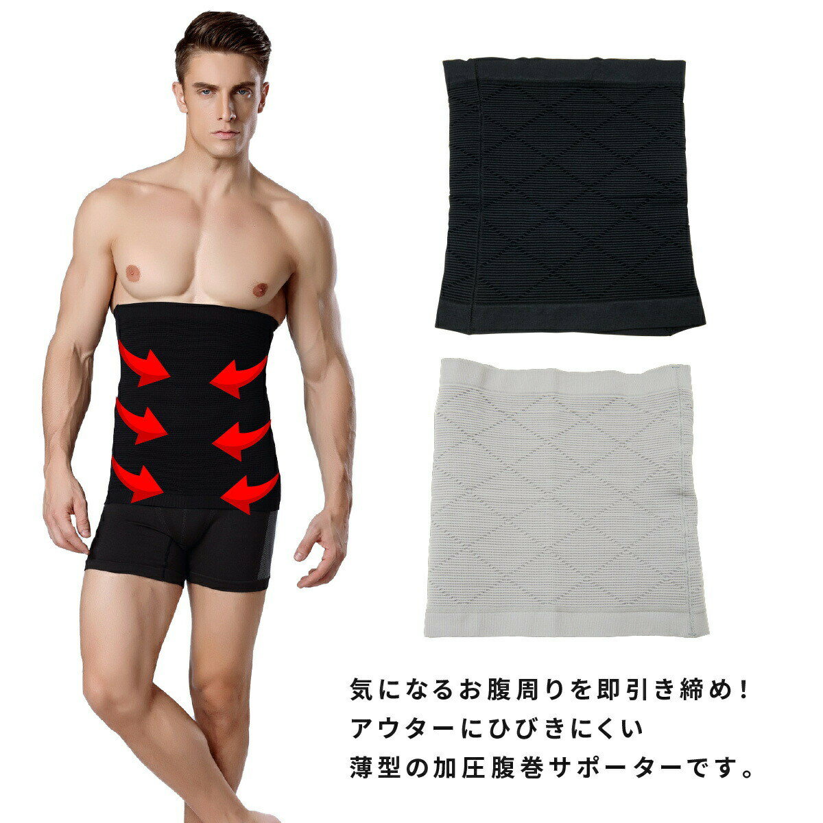 【送料無料】加圧腹巻き サポーター 腹巻 加圧ベルト ウエストサポーター 加圧インナー ウエストバンド コルセット 腰用 引き締め 姿勢矯正 メンズインナー ウエストベルト 下腹 補正下着 シェイプアップ お腹 普段使いからスポーツ時にも 加圧腹巻 加圧シャツ 気になるお腹周りを即引き締め!アウターにひびきにくい薄型の加圧腹巻サポーターです。ぽっこりと気になるウエスト周りを一瞬で加圧するからあっという間に楽々スタイルアップ!伸縮性の高い生地で、激しい動きでも体にしっかりとフィットします。スポーツ時などにもズレずに快適。裏地は凸凹のあるウェーブ織になっており、動くたびにお腹の肉を刺激します。通気性がよく汗をかいても蒸れずに快適。運動中や長時間の使用でも快適にお過ごしいただけます。薄いので服の下につけても目立ちにくく、付けている事が周囲にバレません!薄くてもしっかり引き締めます。■カラーブラック(黒色)グレー(灰色)■サイズM(ウエスト目安76cm〜84cm)L(ウエスト目安84cm〜94cm)■素材ナイロン・ポリウレタン 2