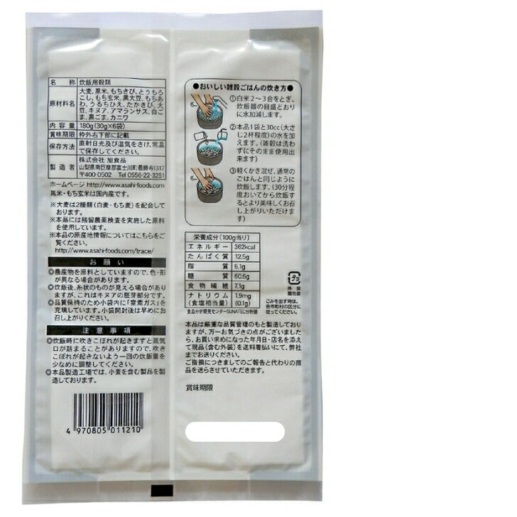 商品情報名称炊飯用穀類原材料名大麦(国内産)、黒大豆、もち玄米、もちきび、もちあわ、黒米、とうもろこし、赤米、緑米、たかきび、発芽玄米、はとむぎ、うるちひえ、黒ごま、白ごま※黒米、発芽玄米、赤米、もち玄米、緑米は、国内産です。 内容量180g(30g×6袋)賞味期限商品枠下部に記載保存方法直射日光及び湿気をさけ、常温で保存してください。製造者株式会社旭食品〒400-0502山梨県南巨摩郡富士川町最勝寺1317贅沢穀類 十六穀ごはん 雑穀 雑穀米 雑穀ごはん 十六穀 黒米 もちもち もち麦入り ふっくらもちもち 十六穀ごはん。もち麦・キヌア・アマランサス・カニワ配合。 8