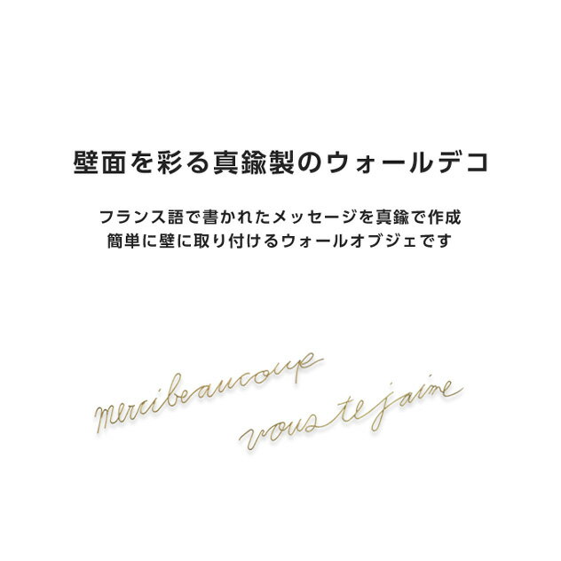 商品名 Brass Letter ブランド WEST VILLAGE TOKYO サイズ merci beaucoup : W31 x H4.5cnm vous te jaime : W31.5 x H4.5cnm 説明 手書き文字を細い真鍮で表現したウォールデコ。 取り付けは、本体に画鋲のようなピンがついていますので、壁に直接差し込むだけで簡単に取り付けが可能です。 壁面から少し浮かすことで浮き出る影が立体感を感じさせ他ではみないインテリアに。 フランス語で merci beaucoup/メルシーボークー(ありがとう) vous te jaime ヴ・トゥ・ジェーム(自分を愛する) の2種類よりお選びください。 約30cmほどのサイズで、大きすぎず程よく主張するサイズ。 何もない殺風景な壁もこういったアクセントを入れるだけで見違えます。 備考 ・細いフレームのため、多少歪んでいる場合もございます。 ・真鍮の特性として経年変化によるくすみがでます。 ※初めから多少くすんでいます。 ・溶接痕や加工痕をそのまま残しています。 ・ピン部分は曲がりやすいので、取り付け時にはピンが曲がらないように注意しながら取り付けてください。 手書き文字を細い真鍮で表現したウォールデコ。 取り付けは、本体に画鋲のようなピンがついていますので、壁に直接差し込むだけで簡単に取り付けが可能です。 壁面から少し浮かすことで浮き出る影が立体感を感じさせ他ではみないインテリアに。 フランス語で merci beaucoup/メルシーボークー(ありがとう) vous te jaime ヴ・トゥ・ジェーム(自分を愛する) の2種類よりお選びください。 約30cmほどのサイズで、大きすぎず程よく主張するサイズ。 何もない殺風景な壁もこういったアクセントを入れるだけで見違えます。 フランス語で書かれたメッセージを真鍮で作成 簡単に壁に取り付けるウォールオブジェです merci beaucoup/メルシーボークー (ありがとう) vous te jaime ヴ・トゥ・ジェーム (自分を愛する) 約30cmほどで大きすぎず程よく主張するサイズ。 何もない殺風景な壁もこういったアクセントを入れるだけで見違えます。 本体にピンがついているので、壁に直接差し込むだけで 簡単に取り付けが可能です。 少し浮くように浅くピンを刺せば 太陽光などの光で陰影が映し出されます。 女性が持つとこれぐらいのサイズです。 merci beaucoup : W31 x H4.5cnm vous te jaime : W31.5 x H4.5cnm 細くシャビーな質感の真鍮素材を使用。 真鍮の特性として経年変化によるくすみがでます。 ※初めから多少くすんでいます。 裏面 本体は2本のピンでとりつけます。 本体にピンがそのまま溶接で取り付けられています。 ※ピン部分は曲がりやすいので、取り付け時には ピンが曲がらないように注意しながら取り付けてください。 点は単独でピンになっています。 merci beaucoup は1本 vous te jaime は2本 商品名 Brass Letter ブランド WEST VILLAGE TOKYO サイズ merci beaucoup : W31 x H4.5cnm vous te jaime : W31.5 x H4.5cnm 備考 ・細いフレームのため、多少歪んでいる場合もございます。 ・真鍮の特性として経年変化によるくすみがでます。 ※初めから多少くすんでいます。 ・溶接痕や加工痕をそのまま残しています。 ・ピン部分は曲がりやすいので、取り付け時にはピンが曲がらないように注意しながら取り付けてください。 備考 手書き文字を細い真鍮で表現したウォールデコ。 取り付けは、本体に画鋲のようなピンがついていますので、壁に直接差し込むだけで簡単に取り付けが可能です。 壁面から少し浮かすことで浮き出る影が立体感を感じさせ他ではみないインテリアに。 フランス語で merci beaucoup/メルシーボークー(ありがとう) vous te jaime ヴ・トゥ・ジェーム(自分を愛する) の2種類よりお選びください。 約30cmほどのサイズで、大きすぎず程よく主張するサイズ。 何もない殺風景な壁もこういったアクセントを入れるだけで見違えます。