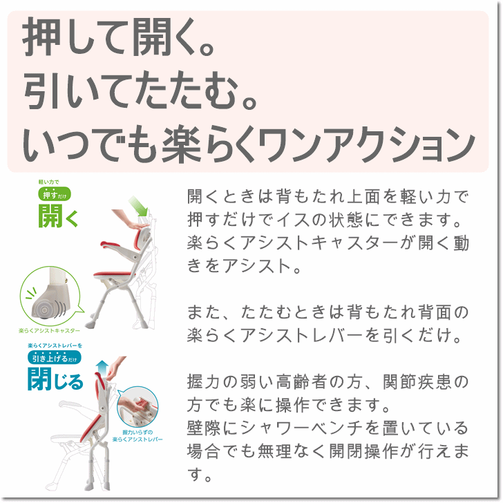■■■ ■■■ 商品詳細 押して開く。引いてたたむ。 〜いつでも、楽らくワンアクション〜 【開く】 ■楽らくアシスト背もたれ 背もたれ上面のレバー部を軽い力で押すだけでイスの状態にできます。 ■狭い浴室でもイスの状態にできる 壁際にベンチを置いている場合でもベンチを傾ける必要なく、ベンチを開くことができます。 ■楽らくアシストキャスター 前脚に「楽らくアシストキャスター」を搭載。開く動きをアシストします。 【閉じる】 ■握力いらずの楽らくアシストバー 引き上げるだけで折りたためるので、握力の弱い方、関節疾患の方でも楽に操作できます。 ■狭い浴室でも折りたためる 壁際にベンチを置いている場合でも無理なくレバーを操作できます。 ■座面高さが最大48cmまで調節可能 座面が高いので、ひざを曲げるのが辛い方でも立ち座りが楽に行えます。 ■背もたれ角度が調節可能 ソフトパッドを上下反転して装着するだけで簡単に背もたれ角度を調節できます。 ■お手入れしやすいソフトパッド 座面ソフトパッドの水抜き穴を1ヵ所だけにしたことで、お手入れの手間を軽減できます。 取り外して洗えます。 ■コンパクトに折りたたみ 折りたたみ幅わずか16cm(座面ロック時)。 介助スペースの確保や収納時に便利です。 最大使用者体重:100kg ※組立完成品 商品仕様 【サイズ】 <イスの状態> 幅51×奥行48〜53×高さ71〜83cm 《座面までの高さ:36〜48cm(7段階=2cmピッチ)》 <折りたたみ時> (開閉ロック時) 幅51×奥行16×高さ83.5〜96.5cm (開閉ロック解除時) 幅51×奥行22×高さ83.5〜96.5cm 【座面サイズ】 幅47×奥行32.5cm 【カラー】グリーン・ブルー・レッド 【重量】約5.2kg 【最大使用者体重】100kg 【材質】 座面・背もたれ:ポリエチレン グリップ:エレストマー(防カビ加工) ひじ掛け:ポリプロピレン 脚ゴム:合成ゴム(防カビ加工) ソフトパッド:EVA樹脂(防カビ加工) パイプ:アルミニウム 【メーカー】アロン化成(株) ※ のし、ラッピング、カードのサービスはご利用いただけません。 注意事項 商品画像は色合いや素材感が実際の商品と異なる場合がございます。 モニター・ディスプレイによっても写り方が変ります。予めご了承くださいませ。 ○北海道・沖縄・離島・一部地域は追加送料がかかる場合があります。