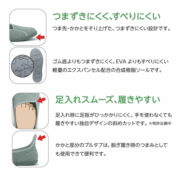 ■■■ ■■■ 商品詳細 【軽くてやわらか よりそい設計】 長い時間を室内で過ごすことが多い方の、足もとの安心安全、快適と健康のために。 かかとを包み込むルームシューズが安心でおすすめです。 ●つまずきにくく、すべりにくい ・つま先・かかとをそり上げた、つまずきにくい設計です。 ・ゴム底よりもつまずきにくく、EVAよりもすべりにくい軽量エクスパンセル配合の合成樹脂ソール。 ●足入れスムーズ、履きやすい ・足入れ時に足指がひっかかりにくく、手を使わなくても履きやすい、独自デザインの斜めカット。(特許出願中) ・かかと部分のプルタブは、脱ぎ履き時のつまみとしても使用できて便利です。 ●軽くてやわらか、歩きやすい ツインフレックス&フットオンコントローラーシステム2採用で歩きやすい設計です。 ・アッパー表素材は綿100%ニット。伸縮性があり、フィット感のよい3層構造です。 ●お名前の記入ができる、インソールのネーム欄 インソールを使えば3E、取り外せば4E相当として、調節して履く事もできます。 ●いつも清潔&速乾 ライニングは制菌加工、インソールは抗菌加工の素材を採用。 商品仕様 【サイズ】 SS(21.0~21.5cm) S(22.0~22.5cm) M(23.0~23.5cm) L(24.0~24.5cm) LL(25.0~25.5cm) 【カラー】スイートピンク、グレー、パウダーブルー 【足囲】3E 【重量】約165g(片足M) 【素材】 アッパー:綿 ソール:合成底 【ヒール外寸】 ヒール高:約1.5cm 【メーカー】アサヒシューズ 注意事項 商品画像は色合いや素材感が実際の商品と異なる場合がございます。 モニター・ディスプレイによっても写り方が変ります。予めご了承くださいませ。 ○北海道・沖縄・離島・一部地域は追加送料がかかる場合があります。 ※商品のお問合せ、納期、ご注文方法のわからない場合など、お気軽にお電話くださいませ。当店よりかけなおさせていただきます。 ■■■ ■■■ ↓こちらもおすすめ↓