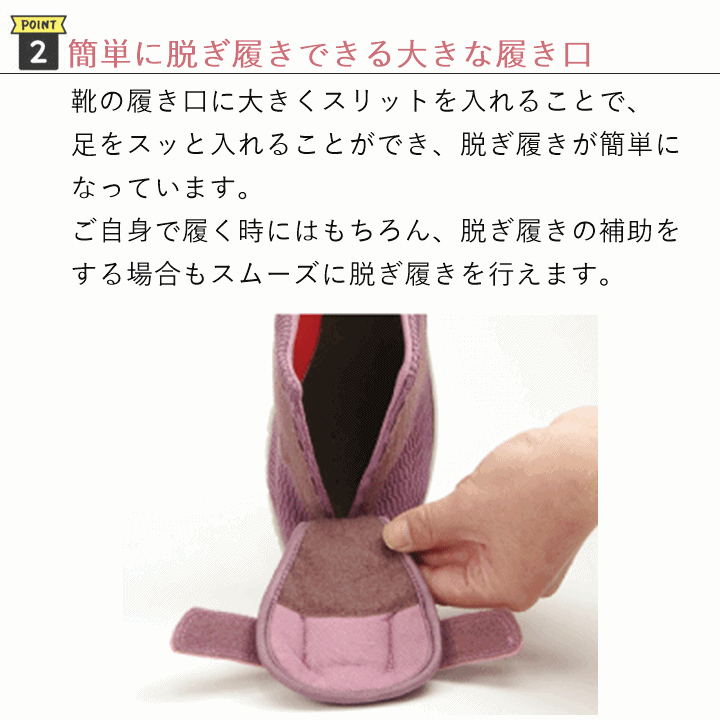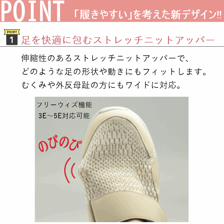 ■■■ ■■■ 商品詳細 スッと足が入る!優しいストレッチニットシューズ ポイント.1 ■足を快適に包むストレッチニットアッパー 伸縮性のあるストレッチニットアッパーで、どのような足の形状や動きにもフィットします。むくみや外反母趾の方にもワイドに対応。 フリーウィズ機能(3E~5E 対応可能) ■簡単に脱ぎ履きできる大きな履き口 靴の履き口に大きくスリットを入れることで、足をスッと入れることができ、脱ぎ履きが簡単になっています。ご自身で履く時にはもちろん、脱ぎ履きの補助をする場合もスムーズに脱ぎ履きを行えます。 ■つまずきにくいスムーズな歩行設計 つま先を巻き上げたロールアップ構造でつまずきにくく、歩行時の蹴り出しがスムーズに行えます。また、屈曲性抜群の靴底を採用していますので、足裏の動きにフィットし、スムーズな歩行をサポートしてくれます。 ポイント.2 ■2WAYウィズシステム インソールが2枚敷きになっており、下敷きを取り除けばよりゆったりとしたサイズ感でご使用いただけます。ストレッチニットアッパーとのコンビネーションで、今までにない履き心地になっています。 ■簡単ウィズ調整 つま先まで開く甲部マジックの開き具合の調整により、簡単にウィズ調整を行っていただけます。甲高・幅広の方でも別注することなく快適にご使用いただけます。 ■ワイドなサイズ対応 ストレッチニットアッパーと2WAYウィズシステムと甲部マジック調整の組み合わせで、サイズの許容範囲が広くなっています。むくみ、外反母趾で履物にお困りの方、左右で足の大きさが違う方でも、別注することなくご使用いただけます。 ●男女兼用 ※サイズ目安表 ご注意※ ・足囲はサイズ目安表数値より「 +20mm ~ -10mm 」の範囲で十分ご使用いただけます。 ・あくまでも、ラスト(製造上の木型)寸法から算出された参考数値であり、使用素材や調整機能により数字以上にゆったりとご使用いただけます。 商品仕様 【サイズ】 Sサイズ:22.0~22.5cm Mサイズ:23.0~23.5cm Lサイズ:24.0~24.5cm LLサイズ:25.0~25.5cm 【カラー】ブラック、パープル、ベージュ 【重量】165g(片足Mサイズ) 【甲材】二重編みニット・合成皮革 【底材】EVA・合成ゴム 【メーカー】株式会社 マリアンヌ製靴 注意事項 商品画像は色合いや素材感が実際の商品と異なる場合がございます。 モニター・ディスプレイによっても写り方が変ります。予めご了承くださいませ。 ○北海道・沖縄・離島・東北地域は追加送料がかかる場合があります。 ※商品のお問合せ、納期、ご注文方法のわからない場合など、お気軽にお電話くださいませ。当店よりかけなおさせていただきます。 ■■■ ■■■ ↓こちらもおすすめ↓