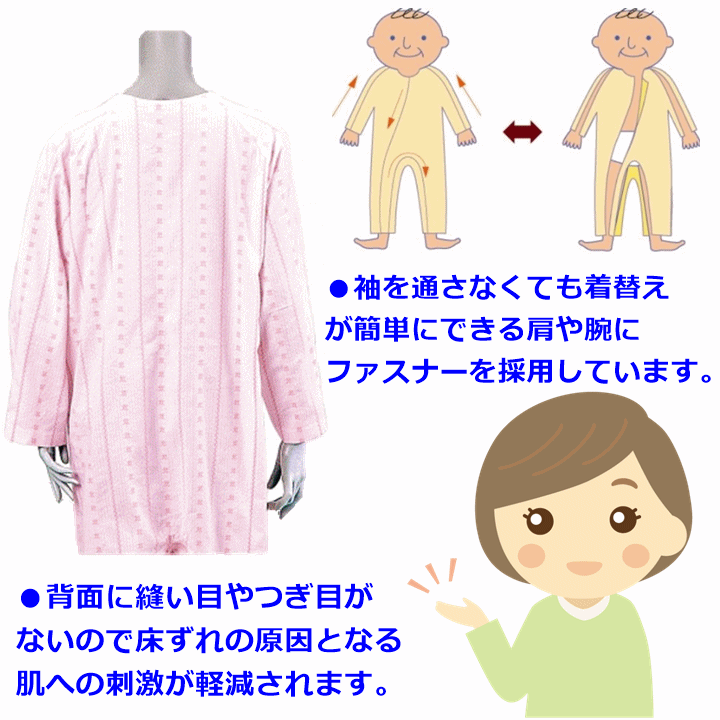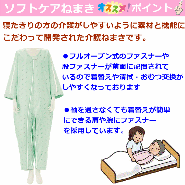 ■■■ ■■■ 商品詳細 ※この商品は【おむついじり】 等を防止する為の【タッチホック】等のボタンはついておりません。 ■「ソフトケアねまき」は、寝たきりの方を介護がしやすいよう素材と機能にこだわって開発された介護ねまきです。 ●フルオープン式のファスナーや股ファスナーを前面に配置することにより、着替えや清拭・おむつ交換がしやすくなります。 ●袖を通さなくても着替えが簡単にできる腕ファスナーを採用しました。 ●背面に縫い目やつぎ目がないので、床ずれの原因となる肌への刺激が軽減されます。 ●生地は各タイプともソフトな肌ざわりの素材を使用しています。 商品仕様 【カラー】 [ 厚手 ](ネル生地) 紺 [ スリーシーズン ](ブロード生地) むらさき・だいだい・みどり [ スリーシーズン・スナップボタン ](ブロード生地) グリーン・ブルー [ 薄手 ](サッカー生地) ピンク・ブルー 【素材】 [ 厚手 ]綿68%・ポリエステル32% [ スリーシーズン ]綿100% [ スリーシーズン・スナップボタン ]ポリエステル65%、綿35% [ 薄手 ]綿100% 【サイズ】 S:身長140〜155cm,胸囲80〜88cm,ヒップ82〜90cm M:身長150〜165cm,胸囲88〜96cm,ヒップ87〜95cm L:身長160〜175cm,胸囲96〜104cm,ヒップ92〜100cm LL:身長170〜180cm,胸囲104〜112cm,ヒップ97〜105cm 【規格】 厚手 紺 スリーシーズン むらさき、スリーシーズン だいだい、スリーシーズン みどり スリーシーズン(スナップボタン) スリーシーズングリーン、スリーシーズン ブルー 薄手 ピンク、薄手 ブルー 【メーカー】(株)竹虎 注意事項 商品画像は色合いや素材感が実際の商品と異なる場合がございます。 モニター・ディスプレイによっても写り方が変ります。予めご了承くださいませ。 ○離島・一部地域は追加送料がかかる場合があります。 ※商品のお問合せ、納期、ご注文方法のわからない場合など、お気軽にお電話くださいませ。当店よりかけなおさせていただきます。 ■■■ ■■■ ↓腕ファスナータイプ:季節で選ぶ↓ ↓両開きファスナータイプ:季節で選ぶ↓ ↓腕ファスナータイプ:まとめ買いでお得!!↓ ↓両開きファスナータイプ:まとめ買いでお得!!↓ ↓どれでも選べる:まとめ買いでお得!!↓