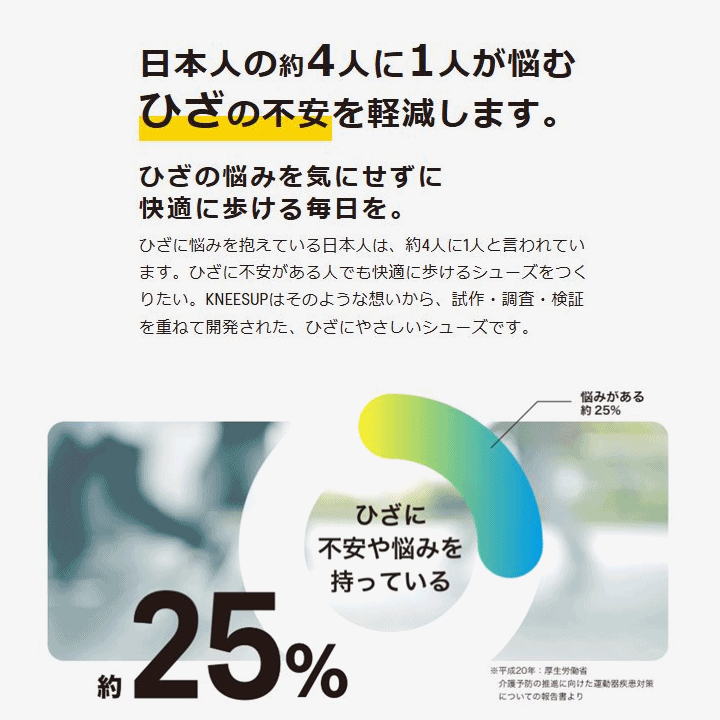 ■■■ ■■■ 商品詳細 ひざの負担を 軽くするシューズ 「あなたのひざを快適に」をコンセプトに、O脚などひざ関節の内反に伴う、ひざへの負担を軽減するウォーキングシューズ・KNEESUP(ニーズアップ)。ウォーキングや散歩に活用したい、アクティブモデルです。 産・学・医で共同開発のクッション機能「MCCS」を搭載。 靴底内側に配置したクッションが、かかと荷重時にたわむことで外側から内側に傾斜。ひざ関節を内側へ誘導することで、ひざへの負担を軽減しています。 ミッドソールはスムーズな歩行をサポートする舟底設計を採用。 かかと部には衝撃緩衝機能GELを搭載しています。 足なじみのよいポリウレタン素材を採用したインナーソールは、立体形状で高いフィット感を追求。 かかと部のカウンター(かかと芯)は、外側着地によるかかとの内倒れを抑えるため、内側を長く設計。 アッパーには軽く通気性のよいメッシュを採用。 シームレスな構造で軽量性を追求しています。 内側にファスナーを配置し、脱ぎ履きも簡単です。 アシックスストライプがアクティブな印象を演出。 アッパー主材料の人工皮革の基布層にリサイクルポリエステルを使用し、環境に配慮しています。 かかと部には反射プリントを採用し、夜間の視認性に配慮。毎日のウォーキングが楽しく快適になる、健康増進に役立てたいアイテムです。 ゆったりした履き心地の4Eウィズ相当です。 ●足元から ひざの不安を軽くします 『ひざに悩みを抱えている人が安心して歩けるシューズ』をコンセプトに誕生したのがKNEESUPです。 衝撃緩衝材や特許を取得した当社独自の技術で、歩行時のひざへの負担を軽減します。 ●独自機能でひざと足を やさしくサポート ソールかかと部に搭載されたGELが着地の衝撃を緩衝。 さらに特許取得の当社独自クッション構造MCCSが着地時にひざの角度を補正し、歩行時のひざの負担を軽減します。 ●ひざ角度を補正して負担を軽減 ひざへの負担を軽減するのが特許取得の当社独自クッション構造“MCCS”。 ソールかかと部内側に搭載したこのMCCSが着地時にたわみ、ひざの角度を適切な状態へ補正して、ひざ関節にかかる負担を軽減します。 ●着地の衝撃から足を守るGEL アシックスのランニングテクノロジーから生まれた衝撃緩衝材が、着地の衝撃から足全体をやさしく守ります。 ●立体形状で足にフィットするインナーソール 土踏まずのアーチやかかと部を包み込む足なり立体形状のインナーソールが、 足にここちよくフィットします。 ●高クッション & 歩行アシストミッドソール クッション性が高い厚底設計と歩く推進力をアシストする舟底設計で、やさしい歩き心地とスムーズな歩行をサポートします。 ●かかとをホールドして歩行を安定化インカウンター かかとのホールド性を高めるため、カウンター(かかと芯)の形状を追求。 内外で長さが異なる専用設計を採用しています。 ●ゆとりある幅広ウイズ ウイズにゆとりのあるオリジナル4E相当の靴型で設計されています。 商品仕様 【サイズ】 22.5~25.0cm(0.5cmきざみ) 【足囲】4E相当 【重量】片足 約270g(サイズ23.0cm) 【素材】 アッパー:合成繊維/合成樹脂/人口皮革 アウターソール:ゴム底・合成底 【インナーソール】取り外し式 【カラー】 ・ネイビーブルー×ライトブルー ・ブラック×メタリックグレー ・ベージュ×シャンパンゴールド ・ワイン×ワイン 【生産国】ベトナム 【メーカー】アシックス商事 注意事項 商品画像は色合いや素材感が実際の商品と異なる場合がございます。 モニター・ディスプレイによっても写り方が変ります。予めご了承くださいませ。 ○沖縄・離島・一部地域は追加送料がかかる場合があります。 ※商品のお問合せ、納期、ご注文方法のわからない場合など、お気軽にお電話くださいませ。当店よりかけなおさせていただきます。 ■■■ ■■■ ↓asics(アシックス)のスニーカー↓ ↓こちらもおすすめ↓