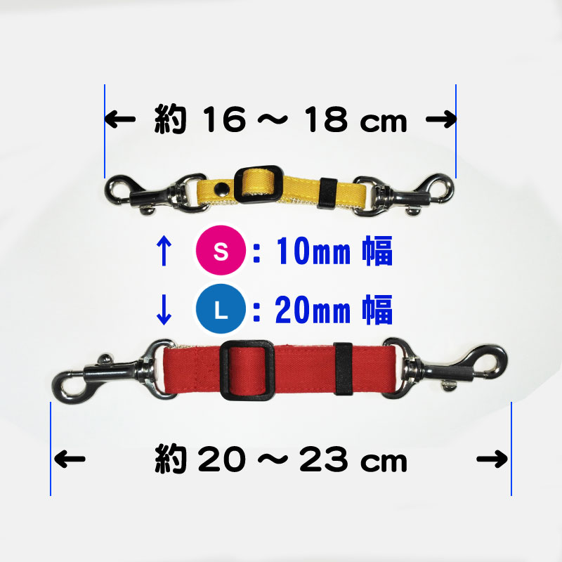 首輪とハーネス、両方使うとより安心してお散歩が出来ますよね。 でも、リードはどっちに繋ごう…首輪?ハーネス?両方? 両方繋いだ方が安心だけど、2本のリードを持つのも大変。 後ずさりしたりゴロゴロしたがるワンちゃんだとハーネスが抜けそうで怖い。 そんなお悩みを解消するのがこちら、首輪とハーネスを繋げるジョイントフックです。 首輪とハーネス、それぞれのDカンに繋ぐことでリードが1本で済みます。 また、繋げることでハーネスが完全に抜けてしまうのを防ぎます。 日本製、どんなデザインにも合わせることが出来る無地のデザインです。 サイズは10mm幅と20mm幅がございます。 Lサイズのナスカンは大きめのものを使用し、ダブルリングでも無理なく繋げられる設計となっております。 ※ 当社ブランドのDカンサイズを基準にしたナスカンサイズの為、他社製品では金具が入らない可能性がございます。 S…幅:10mm 長さ:約16〜18cm 径:約6mm×8mm L…幅:20mm 長さ:約20〜23cm 径:約8mm×10mm ※ 写真のイメージや色が実物と違って見える場合があります。 日本製 表面生地:綿100% 裏面生地:PP (唐草のバージョンもこちらにございます。) 【クルールシリーズ・ラインナップ】 かわいいペットグッズ専門店 Zenpets(ゼンペッツ)の取り扱いの各商品は様々なタイプの犬(いぬ・dog・inu・わんちゃん・ワンちゃん・わんこ・ワンコ)や犬種にも対応しております!(こいぬ(子犬)/小型犬/中型犬/大型犬/北海道犬/秋田犬/紀州犬/土佐犬/極小犬/プードル/トイ・プードル/チワワ/ダックスフンド/ミニチュア・ダックスフンド/ポメラニアン/ヨークシャー・テリア/パピヨン/シー・ズー/フレンチ・ブルドッグ/柴犬/豆柴/ミニチュア・シュナウザー/マルチーズ/コーギー/パグ/ミニチュア・ピンシャー/ラブラドール・レトリーバー/ゴールデン・レトリーバー/ビーグル/ボーダー・コリー/ペキニーズ/ボストン・テリア/ホワイト・テリア/ブルドッグ/ドーベルマン/シベリアン・ハスキーetc) ※商品のサイズと愛犬のサイズをよくご確認してご購入くださいませ。 当商品以外にも当店は様々な犬用グッズを取り扱っております!【スタッフのオススメ・ポイント】 お散歩中に後ずさりしたりゴロゴロしたがるワンちゃんだとハーネスが抜けそうで怖い。 かといって、首輪にもリードを繋いで2本持ちは大変、そんなお悩みを解消するのがこちら、首輪とハーネスを繋げるジョイントフックです。 首輪とハーネス、それぞれのDカンに繋ぐことでリードが1本で済みます。 また、繋げることでハーネスが完全に抜けてしまうのを防げます。 無地のデザインだからこそ、どんなデザインの首輪やハーネスにも合わせやすいのが魅力です。 製品バリエーション 唐草模様無地 商品詳細 サイズ S…幅:10mm 長さ:約16〜18cm L…幅:20mm 長さ:約20〜23cm 素材 表生地:綿100% 裏生地:PP 送料 送料無料 注意事項 ご使用上の注意 ・写真のイメージや色が実物と違って見える場合があります。 ・ナスカンに錆びが発生してしまっ場合は直ちに使用を中止してください。
