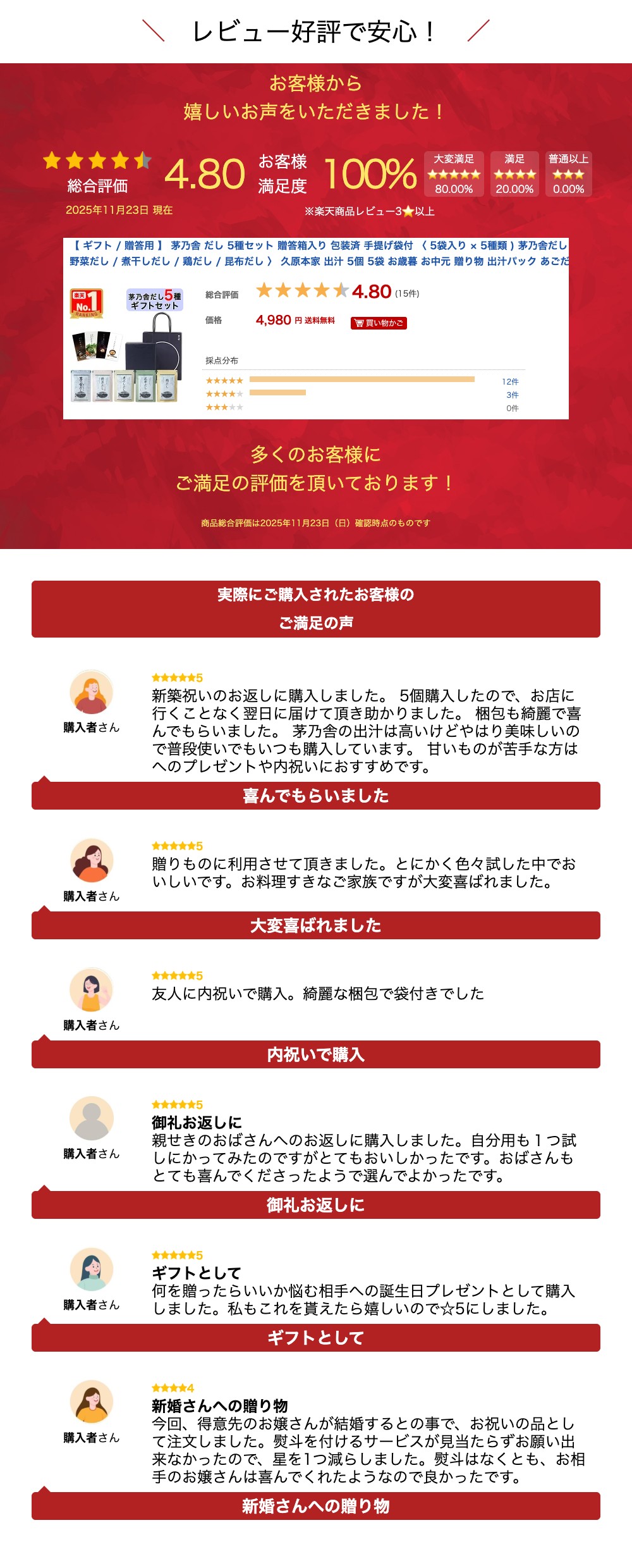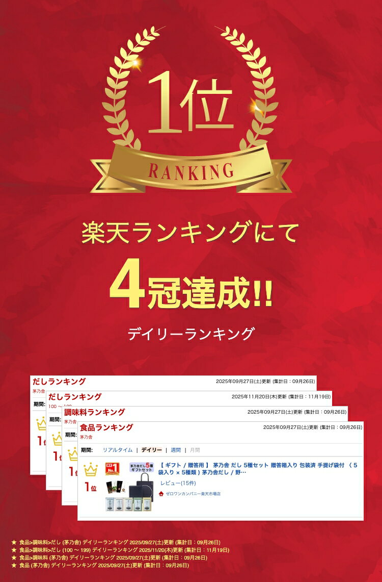 【関連ワード】 コンビニ受け取り コンビニ受取 はこぽす 箱ぽす ロッカー受け取り ロッカー受取 コンビニ 郵便局 ロッカー ファミリーマート ファミマ ローソン ミニストップ 受け取り 受取 最強配送 父の日 お正月 年末年始 お年始 お彼岸 あごだし 出汁パック だしパック 茅乃屋のだし kayanoya 萱野や 萱のや カヤのや 蚊帳のや 加悦のや 茅乃舎だし 関連商品【 ギフト / 贈答用 】 茅乃舎だし (8g×18袋) 海乃七草味...【 ギフト / 贈答用 】茅乃舎だし (8g×18袋)・ 野菜だし (...【 ギフト / 贈答用 】 贈答箱入り 特選 茅乃舎 極みだし ( 8...5,280円4,980円4,980円【 ギフト / 贈答用 】 茅乃舎 だし 3種セット 贈答箱入り 手提...【 ギフト / 贈答用 】 茅乃舎だし (8g×18袋) 贈答箱入り ...【 茅乃舎 】 茅乃舎だし ( 8g × 30袋入 ) × 2個セット...2,880円2,780円5,780円【お得な減塩セット】 減塩 茅乃舎だし 8g×27袋 & 減塩野菜だし...【お得なセット】 茅乃舎だし 8g×30袋 & 野菜だし 8g×24袋...【28時間だけ★100円OFF】 【 茅乃舎 】 減塩茅乃舎だし ( ...5,780円5,780円5,780円【 茅乃舎 】 茅乃舎だし ( 8g × 30袋入 ) × 3個セット...【 ギフト / 贈答用 】 茅乃舎だし (8g×18袋)・ 野菜だし ...【 茅乃舎 】 減塩茅乃舎だし ( 8g × 27袋入 ) × 3個...7,580円8,978円7,580円関連ワード: 茅乃舎 茅乃舎だし だし 贈答 贈り物 ギフト かやのやだし 久原本家 出汁セット 送料無料 包装済 手提げ袋付 ランキング 煮干しだし 椎茸だし 野菜だし 昆布だし お歳暮 お中元 母の日 父の日 お正月 年末年始 お年始 お彼岸 あごだし 出汁パック だしパック 茅乃屋のだし商品説明 ✅【 茅乃舎だし 5種 セット!】 茅乃舎だし (8g×5袋入) / 野菜だし (8g×5袋入) / 煮干しだし (8g×5袋入) / 鶏だし (8g×5袋入) / 昆布だし (6g×5袋入) が入ったギフトセットになります!お渡し用の紺の手提げ袋も付属しております。 ✅【 原材料 】 ■ 茅乃舎だし :風味原料[かつお節、煮干しエキスパウダー(いわし)、焼きあご、うるめいわし節、昆布]、でん粉分解物、酵母エキス、食塩、粉末醤油、発酵調味料、(一部に小麦・大豆を含む) ■ 野菜だし :野菜チップ[玉ねぎ(国産)、にんにく、人参]、食塩、酵母エキス、野菜エキスパウダー(玉ねぎ、セロリ、キャベツ)、でん粉分解物、にんにくパウダー ■ 煮干しだし :風味原料【煮干し[かたくちいわし(国産)、あご]、煮干しエキスパウダー(いわし)、うるめいわし節、昆布、椎茸、焼きあご】、でん粉分解物、酵母エキス、発酵調味料、食塩、(一部に小麦・大豆を含む) ■ 鶏だし :鶏削り節(国内製造)、チキンエキスパウダー、酵母エキス、でん粉分解物、食塩、粉末しょうゆ、(一部に小麦・大豆・鶏肉を含む) ■ 昆布だし :風味原料(昆布、昆布エキスパウダー、椎茸エキスパウダー、椎茸)、酵母エキス、食塩、でん粉分解物、(一部に小麦を含む) ✅【 栄養成分 】 ■ 茅乃舎だし :1袋(8g)当たり 熱量25kcal 、たん白質2.45g、脂質0.23g、炭水化物3.31g、食塩相当量1.06g ■ 野菜だし :1袋(8g)当たり 熱量20kcal、たん白質1.19g、脂質0.03g、炭水化物3.72g、食塩相当量2.24g ■ 煮干しだし :1袋(8g)当たり 熱量26kcal、たん白質3.25g、脂質0.18g、炭水化物2.86g、食塩相当量0.61g ■ 鶏だし :1袋(8g)当たり 熱量25kcal、たん白質3.21、脂質0.18g、炭水化物2.63g、食塩相当量1.40g ■ 昆布だし :1袋(6g)当たり 熱量15kcal、たん白質0.64g、脂質0.02g、炭水化物3.18g、食塩相当量1.68g ✅【 アレルゲン 】 ■ 茅乃舎だし :小麦、大豆 ■ 野菜だし :無(※ただし同じ工場で小麦を含む商品を製造しています) ■ 煮干しだし :小麦、大豆 ■ 鶏だし :小麦、大豆、鶏肉、(米) ■ 昆布だし :小麦 ✅【 保存方法 】直射日光を避けて常温で保存