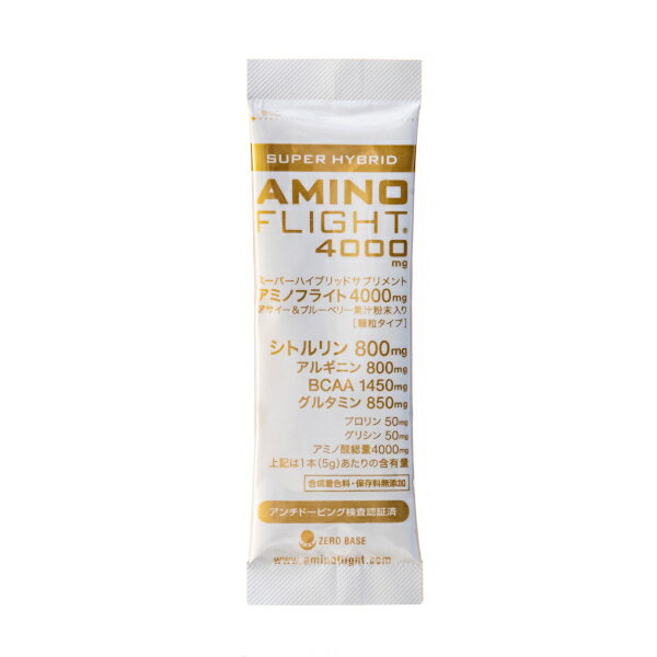 商品名 アミノフライト4000mg スーパーハイブリッド 商品説明 ◆商品特長 究極のアミノ酸サプリメント 1. 瞬発、集中、持久、燃焼、回復系さらに免疫UPに! 2. 速攻20分でスピード吸収!速攻体感! ◆こんな方におすすめ ・瞬発、持久系 アスリート ・健康&美を追求する女性 ・集中、パワーを求めるビジネスマン ・毎日の活力を求める方々へ 金メダリスト、大学病院、医療従事者等からも高評価で多数ご愛用いただいております。 ◆金メダリスト、大学病院、医療従事者等からも高評価をいただける理由 1. 主要成分である【シトルリン】【アルギニン】が血流を良くし、免疫・代謝・体力を一気に上げます。 ※ノーベル賞理論に基づく 2. 最高品質の協和発酵バイオ社製(キリングループ)の【シトルリン】【アルギニン】原料を使用 3. アンチドーピング検査済み 原材料名 シトルリン(米国製造)、アサイー果汁末、ブルーベリー果汁末、ブルーベリーエキス、でんぷん、植物油脂/グルタミン、アルギニン、ロイシン、イソロイシン、バリン、リンゴ酸、香料、甘味料(ステビア、ソルビトール、リボース、スクラロース、アセスルファムK)、クエン酸、プロリン、グリシン、V.C、ナイアシン、V.E、パントテン酸Ca、V.B1、V.B2、V.B6、V.A、葉酸、V.D、V.B12 内容量 1本あたり5グラム 主要成分 シトルリン800mg、アルギニン800mg、BCAA1450mg、グルタミン850mg、グリシン50mg、プロリン50mg、マレート317mg、リボース25mg 販売者 株式会社ZERO BASE 150-0012 東京都渋谷区広尾1-3-12ハイネス恵比寿8F 【アルギニンの主な機能】 ・アルギニンには、成長ホルモンの分泌を通し筋肉増強作用を示します。 ・アルギニンには、血流改善作用があります。 ・アルギニンには、生活習慣病のリスクを下げる作用があります。 ・アルギニンには、免疫力を高める作用があります。 【シトルリンの主な機能】 ・シトルリンには、血管拡張作用があります。 ・シトルリンには、疲労を軽減し、運動能力を向上させるはたらきがあります。 ・シトルリンには、抗酸化物質として活性酸素などの酸化ストレスから細胞を守るはたらきがあります。