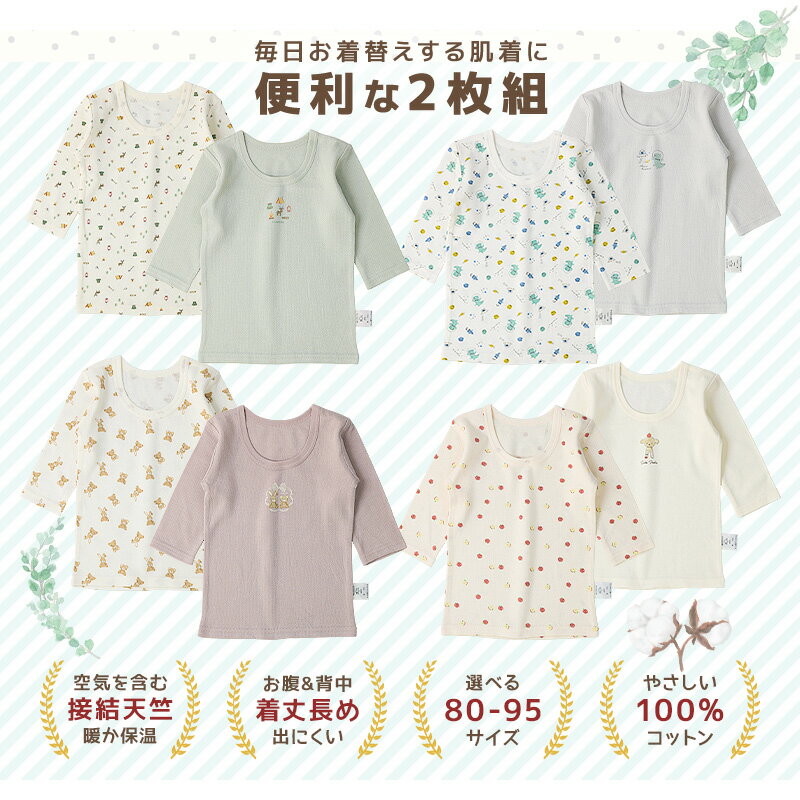 ベビー 肌着 長袖Tシャツ 2枚セット 2枚組 接結天竺 吸湿保温 ふんわり暖かい アンダーウェア 子供 ( 80-95cm ) 宇宙 くま うさぎ リンゴ くだもの 動物 ワンポイント プリント 天然素材 綿100% コットン オールシーズン 80cm 90cm 95cm 出産祝い ギフト