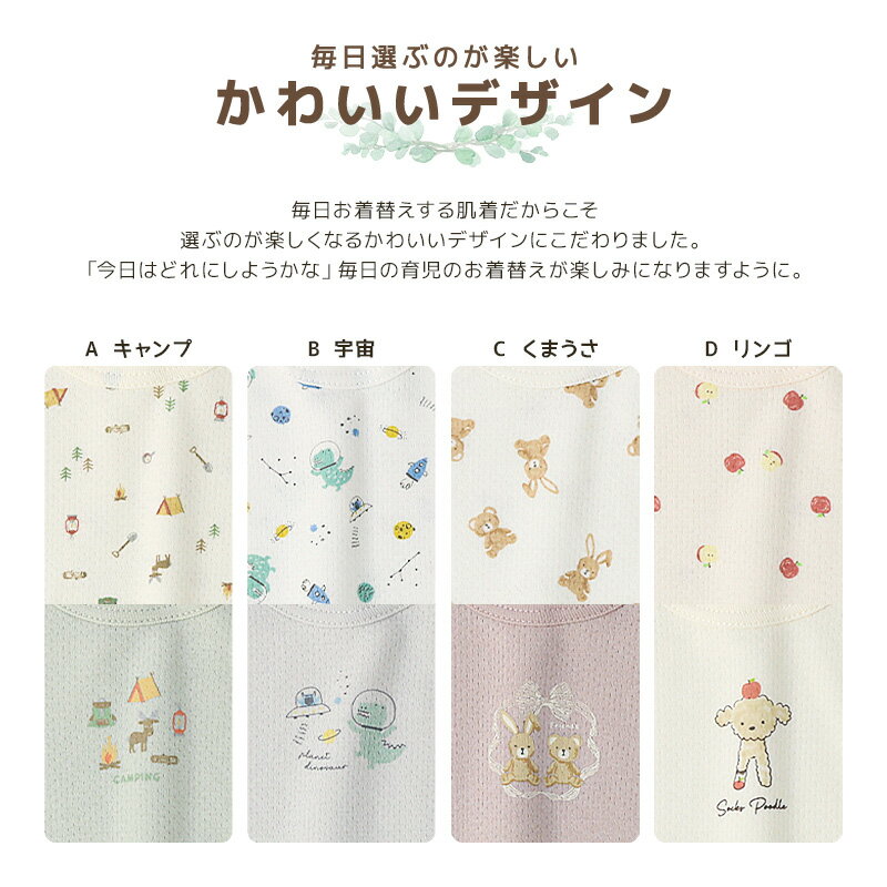 メーカー希望小売価格はメーカー商品タグに基づいて掲載しています 【対象】子供服 こども服 子ども服 キッズファッション キッズ きっず Kids KIDS 低学年 小学生 幼稚園 保育園 幼児 園児 学校 ベビー べびー baby BABY 赤ちゃん 男の子 男児 ボーイ ボーイズ BOY boy Boy BOYS boys 女の子 女児 ガール ガールズ GIRL girl Girl GIRLS girls ユニセックス 男女兼用 兄弟 姉妹 コーデ お揃い【さまざまなシーンにオススメ】通園 通学 幼稚園 保育園 小学校 スクール イベント 運動会 発表会 お出かけ お散歩 公園 お誕生日会 パーティー テーマパーク 遊園地 ハロウィン クリスマス バレンタイン お正月 ゴールデンウィーク デイリー 休日 お祝い 出産祝い 内祝い プレゼント【イメージ】デザイン かわいい 可愛い カワイイ キュート おしゃれ オシャレ お洒落 カジュアル お洒落着 【ショップ】zooland Zooland ZooLand ZOOLAND ズーランド ずーらんど ファッション アパレル ブランド 日本企画類似商品はコチラ 新生児 ベビー 肌着 半袖Tシャツ 2枚セッ1,290円~ベビー 肌着 ロンパース 2枚セット 2枚組 1,749円ベビー キッズ 肌着 2枚セット 2枚組 鹿の1,290円~よく一緒に購入されている商品ベビー 肌着 長袖Tシャツ 2枚セット 2枚組1,749円ベビー 肌着 長袖Tシャツ 2枚セット 2枚組1,419円ベビー キッズ 肌着 半袖 2枚セット 抗菌防1,290円2025/11/18 更新 SPEC 商品番号 235129 商品説明 接結天竺素材 あったか肌着 【素材】 お肌に優しい綿100%素材の接結天竺生地です。 ■接結天竺生地の特徴 デリケートな赤ちゃんのお肌にやさしい、 ふんわり柔らかい快適な接結天竺生地。 ほどよいストレッチ性で身体を優しく包みます。 吸水性に優れていますので、汗をかいても快適・保温もばっちりです。 軽量ながらしっかりした生地で、通気性・強度・耐久性に優れ、 インナーとして活躍、繰り返し洗いなどにも強い生地です。 【デザイン】 ■お子様はもちろんご家族の皆様も癒される優しいプリント柄です。 かわいい総柄とワンポイントのプリントの2枚組です。 ■着丈長め 着丈が長く、お腹や背中が出にくい設計です。 ■長袖肌着 寒い季節にぴったりな長袖の肌着です。 春秋など肌寒い時期の体温調整用インナーとしても最適です。 【機能】 ■吸湿保温 綿100%で吸湿性に優れ、接結部分に空気を含むので ふんわりあったかい生地です。 ■肌あたりが良い仕様 肌にあたる部分の縫い目は凸凹が少ない縫製仕様で、 タグなども内側についておりません。 お肌の刺激が少ない仕様で、安心してご着用いただけます。 ■衿バインダー仕様 衿は、肌触りが良く伸びにくいしっかりしたバインダー仕様です。 素材 接結天竺 吸湿保温 組成 綿100% シーズン 春秋〜冬向け 生地の伸縮性 あり 生地の厚み やや厚い 裏地 なし 仕様 [C・D]スリーマータイプ 取り扱い方法 洗濯機洗い可/酸素系・非塩素系の漂白剤のみ使用可/タンブル乾燥不可/日陰吊り干し/アイロンプリント部分不可/ドライクリーニング不可/ウエットクリーニング可 注意事項 ・表記サイズは平置きで採寸しておりますので、 商品によっては多少の誤差が生じる場合がございます。 ・色に関しましてはPCモニタにより 若干の誤差が生じる場合がございます。 ・濃色の時は、染色の性質上色落ちすることがありますので 他のものと分けて洗濯して下さい。 ・洗濯後は形を整えて直ちに干して下さい。 ・蛍光増白剤入りの洗剤はお避け下さい。 ・混色の場合は、濡れた状態や強い摩擦により合成皮革や他の喪ものに色移りする恐れがありますので、お取り扱いには十分にご注意ください。 ・アイロンをあてる場合、当て布をして下さい。 ・プリント部分とプラスチック釦にはアイロンをあてないで下さい。 企画・原産国 日本企画・中国製 SIZE cm 80 90 95 着丈 40.8 42.8 44.8 肩巾 22.5 24.5 25.5 身巾 27 28 29 前下がり A・B 9.5 9.7 10 前下がり C・D 11.3 11.5 11.8 袖丈 22.5 25 27 表記サイズは平置きで採寸しておりますので、商品によっては多少の誤差が生じる場合がございます。 サイズは個人差がありますので、お子様のサイズに合わせてご注文ください。 ATTENTION ※モニター環境によって、色味が実際の商品と若干の誤差が生じる場合がございます。