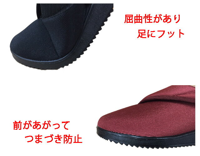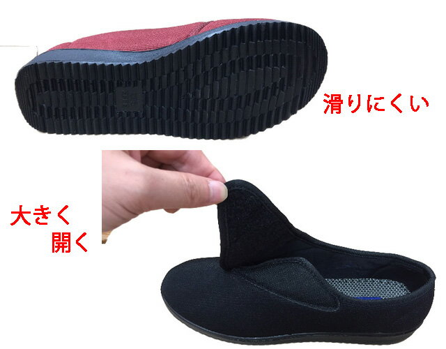 介護シューズ・リハビリ・散歩用シューズ カラー クロ・ワイン 素材 合成繊維 ソール ウレタン樹脂 備考 幅4E(ゆったりしています。) つま先とかかとを巻き上げつまずきを防止。着地や蹴り出しがスムーズに行えます。アウトソールは屈曲性が良く歩きやすく、滑り防止機能付きで安心。ゆったり4E相当の幅広設計でつま先ゆったりらくちん。アッパー素材にはやわらかいストレッチ素材を採用しているので、外反母趾の方でも楽に履けます。甲部分が大きく開くので脱ぎ履きが簡単です。面ファスナー(マジックテープ)式のベルトで足にしっかりフィットします。 とにかく軽いので、お年寄りの方やウォーキングシューズとしても幅広く愛用されています。 履きやすいのはもちろんのこと、履かせやすいので介護用シューズ・リハビリ用シューズとしても最適です。 高齢者の方に人気の商品で、敬老の日や母の日の贈り物としても喜ばれています。