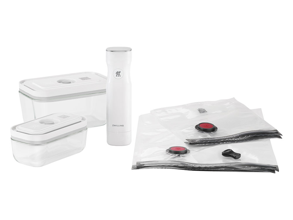 真空保存で食材長持ち!フレッシュ&セーブ新登場 真空ポンプ、ガラスコンテナS/M 、 真空保存バッグS×2/M×2のセット すぐに真空保存を始められる、必要なもの全てが揃ったセット。ハンディに使える真空ポンプに、サイズ違いのコンテナ、繰り返し使えるバッグ入りで、色々な食材や料理に対応。お好みの素材やサイズから選べます。 耐熱温度:本体 280℃ / 蓋 90℃ バッグ 92℃ 耐冷温度:-20℃ 電子レンジ ガラスコンテナ:本体のみ可 バッグ:可/ オーブン ガラスコンテナ本体のみ可/ 冷凍庫可/ 食器洗い機 ガラスコンテナ本体のみ可 生産国 中国 セット内容:真空ポンプ×1、USBケーブル×1、ガラスコンテナS/M各×1、バッグS,M各×2、クリップ×1、リキッドプロテクター×1 ■すぐに始められる全てがそろったお得なセット ■ワンタッチで真空密封できる電動真空ポンプ ■サイズ違いのガラスコンテナ、繰り返し使えるバッグ ■まとめ買いした食材を新鮮なまま保存 ■残ったお料理や作り置きを美味しく保存 ■乾燥を防いでサラダやフルーツの新鮮さもキープ ■冷蔵庫をスッキリ整理 ■専用アプリで簡単食材管理 *注意:ガスを発生させる食品(生のタマネギやニンニク/チーズ/コーヒー豆/発酵食品/一部ペットフード等)など真空に適さない食材もあります。 バッグをご利用の際、調味料を入れて真空にする場合、液体の吸い込みにご注意ください。ポンプに液体が吸い込まれると故障の原因となります。中身の状態を見て、ポンプが自動で停止する前に手動での停止をお願いします。 *フレッシュ&セーブ製品につきましては、品質向上のための製品アップデートにより、予告なく 仕様を変更することがございます。商品ページに掲載されている画像と異なる仕様の製品をお届けすることがございます。あらかじめご了承いただけますようお願い申し上げます。フレッシュ&セーブと合わせて使えるアイテム 真空調理でもっとおいしく 低温調理器 > 時短調理&作り置きに最適 Z-CUT マルチグレーター >