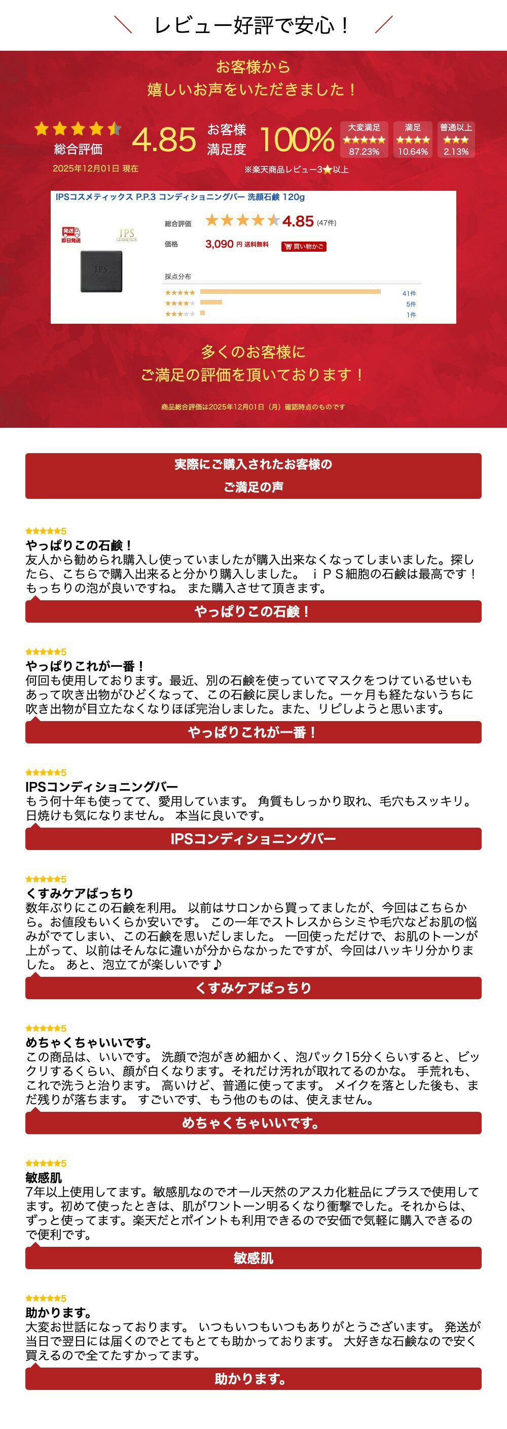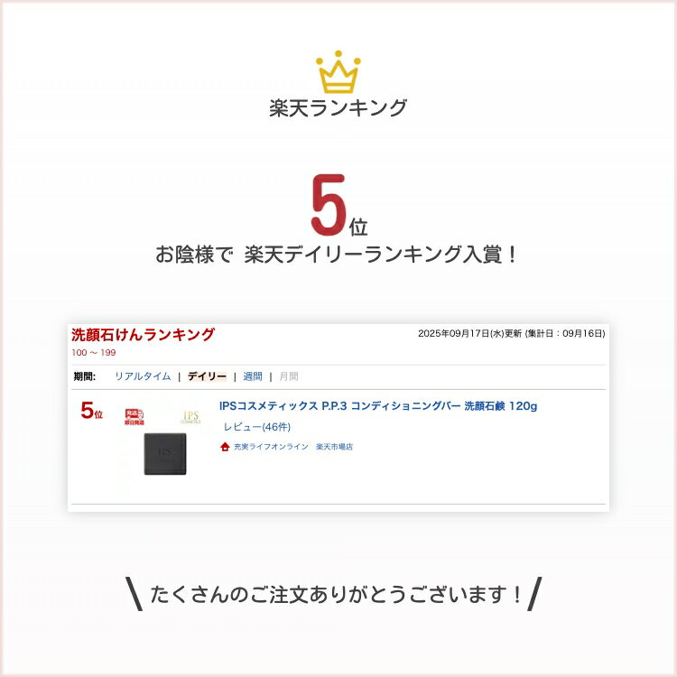 ※こちらの商品に限り、土日祝日、ストアカレンダーが休日になっていても基本的にはご購入当日か翌日には発送をさせて頂きますが、こちらは他サイトでも販売している為、他サイトの販売状況によっては在庫切れになってしまう場合が御座います。その際はお取り寄せを致しますので発送まで数日頂きます。予めご了承頂けます様、お願い申し上げます。 【商品説明】 ホイップクリームのようにきめ細やかで弾力のある泡で、メイク汚れや酸化した皮脂、古くなった角質などを包み込み、すっきりと落とす洗顔ソープです。カミツレ花エキス、ローズマリー葉エキス、コメ発酵液、スクワランなどの保湿成分を配合。肌に必要なうるおいを守りながらやさしく洗い上げ、もっちりと吸いつくような弾力と透明感あふれる肌へと導きます。 【ご使用方法】 手と顔を濡らしてからよく泡立て、泡で顔全体を包み込むようにやさしく洗います。その後、水またはぬるま湯でていねいにすすぎます。 【成分】 石ケン素地、水、パーム脂肪酸、パーム核脂肪酸、グリセリン、カミツレ花エキス、ローズマリー葉エキス、シリカ、コメ発酵液、スクワラン、EDTA-4Na、アルミナ、エチドロン酸4Na、塩化Na、BG、酸化鉄 関連商品6個セット IPSコスメティックス P.P.3 コンディショニングバ...2個セット IPSコスメティックス P.P.3 コンディショニングバ...3個セット IPSコスメティックス P.P.3 コンディショニングバー...13,990円5,980円7,000円サンソリット スキンピールバー 赤135g ティートゥリー 135g ...石鹸ネット付き サンソリット スキンピールバー 赤135g ティートゥ...5個セット スキンピールバー ミニソープ 黒 15g×5個 Skin ...2,420円2,590円3,750円4個セット IPSコスメティックス P.P.3 コンディショニングバー...5個セット IPSコスメティックス P.P.3 コンディショニングバー...スキンピールバー ハイドロキノール 135g 黒 Skin Peel ...9,390円11,690円4,540円2個セット スキンピールバー 赤 135g×2個 ティートゥリー S...サンソリット スキンピールバー 緑 AHA 135g Skin Pee...サンソリット スキンピールバー 青 135g AHAマイルド Skin...4,820円1,960円1,960円